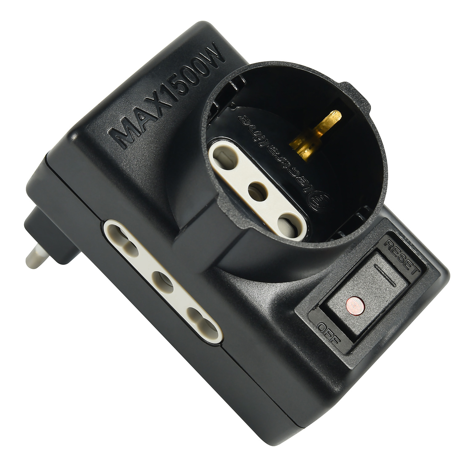 Adattatore 10A con interrutore di sovvracarico. 1 presa Shuko + 2 prese 10/16A. Nero. Ideale per proteggere dispositivi elettronici da sovraccarichi e fornire alimentazione a più apparecchi contemporaneamente. Imballo: Carta appendibile