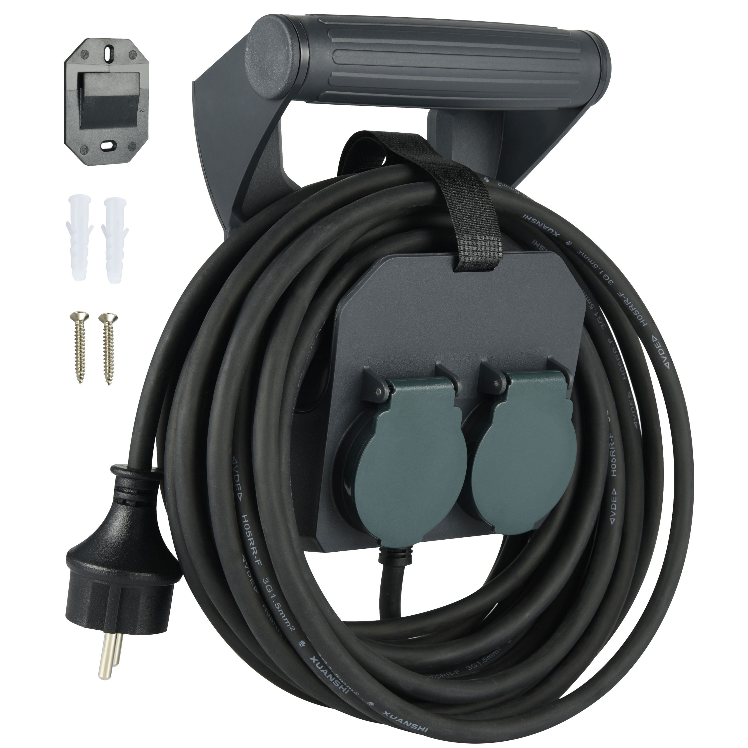 Prolunga con sistema di avvolgiprolunga integrato e maniglia. IP44. 2 prese. 10m H05RR-F 3G1.5. Nero. Ideale per utilizzi allaperto come giardini. cortili e cantieri. offrendo praticità e sicurezza con 2 prese e 10m di lunghezza. Imballo: Etichetta