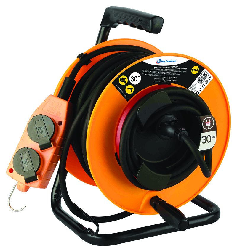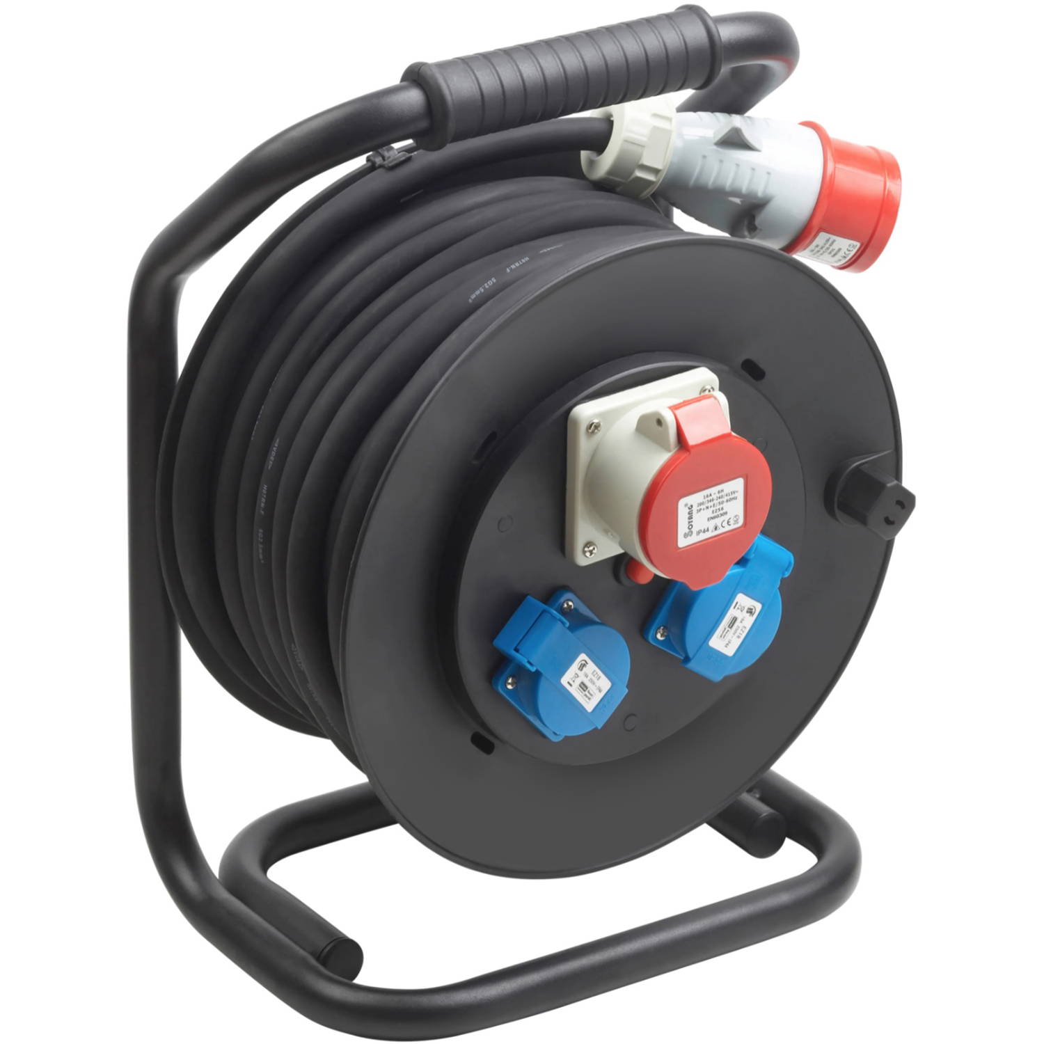 Avvolgicavo Industriale. 1 presa CEE 3P+N+T. 2 prese Schuko IP44. spina CEE 3P+N+T. cavo 20m. H07RN-F 5G2.5. Nero. Ideale per lutilizzo in ambienti industriali e commerciali. Imballo: Etichetta