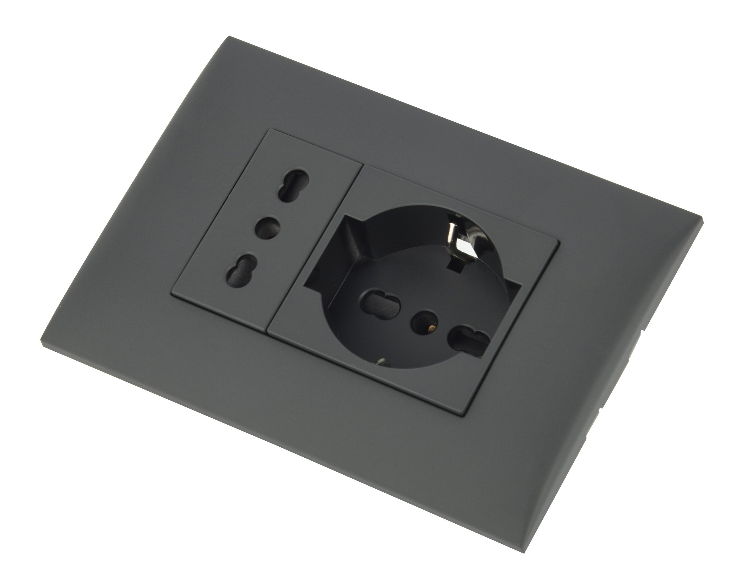 SET PLACCA+PRESA UNIVERSALE+PRESA BIVALENTE NERA. Ideale per installazioni domestiche e commerciali. garantendo una soluzione versatile e pratica per le prese elettriche. Imballo: Sacchetto plastica appendibile