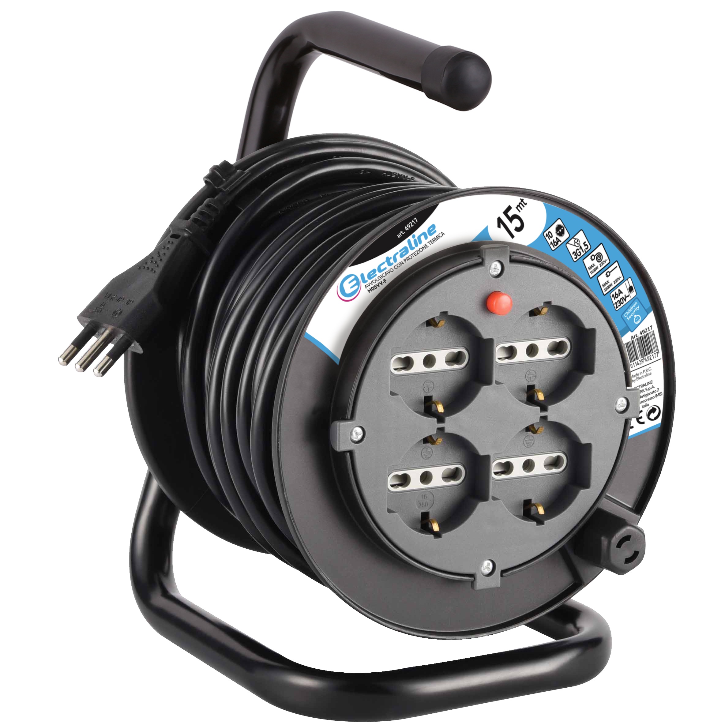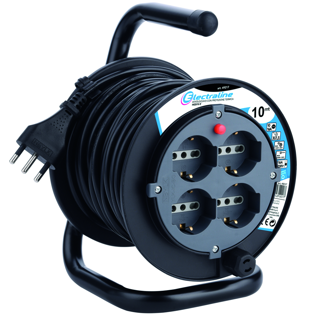 Avvolgicavo Domestico. 4 prese P40 universali. cavo 10m H05VV-F 3G1.5 Nero. Per collegare e distribuire lelettricità in casa. ufficio o qualsiasi ambiente domestico con facilità e sicurezza. Imballo: Etichetta