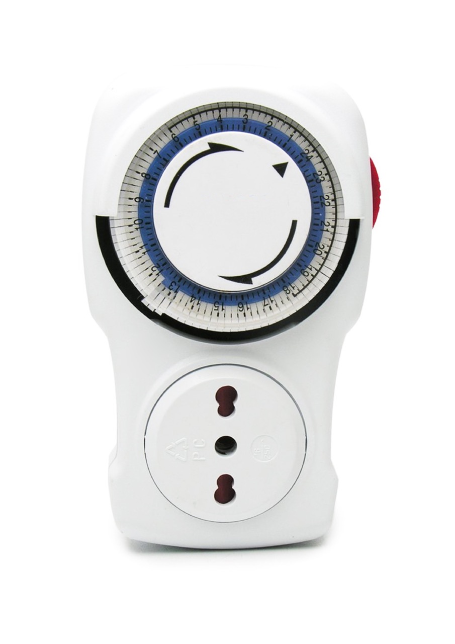 Timer giornaliero. Spina 16 A. Presa 10/16A. Bianco. Ideale per programmare laccensione e lo spegnimento di luci o elettrodomestici esterni in modo automatico e sicuro. Imballo: Blister