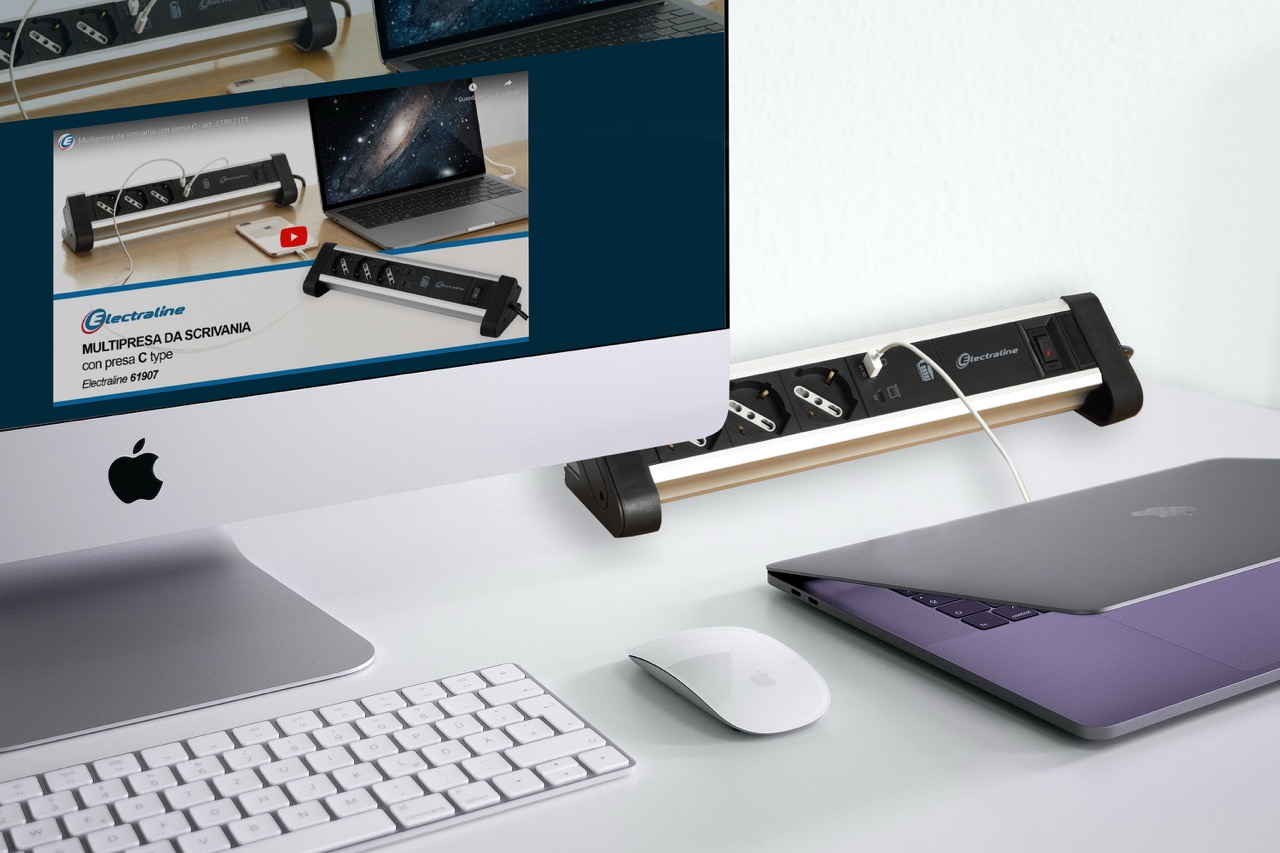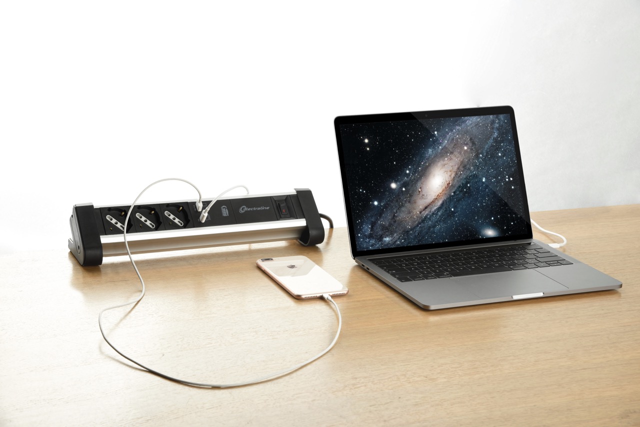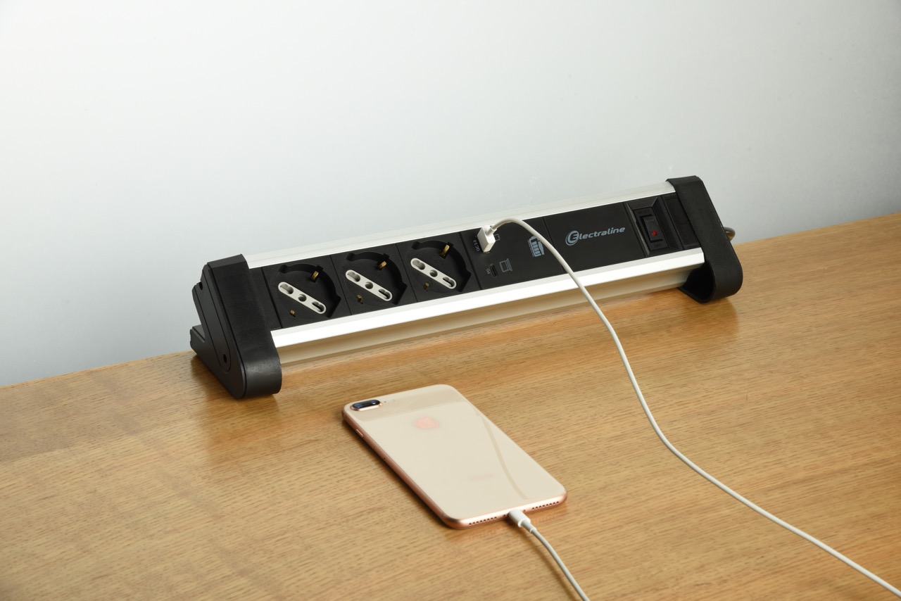 Alu multisocket. 3 sockets. switch. 1 USB A 3.4A + 1 USB C. Cable 2m H05VV-F 3G1.5. Alu / Black. For offices. conference rooms or home environments to connect and protect electronic devices. Packaging: Hanging box