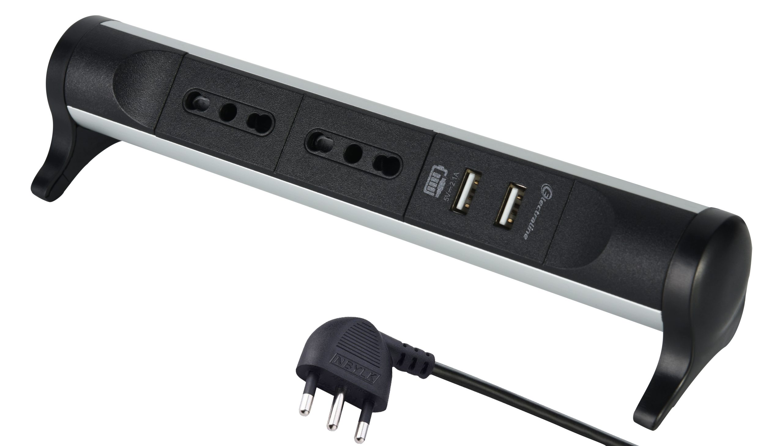 Alu multisocket. 2 bivalent 10/16A outlets. 2 USB A 2.1A . 2m H05VV-F 3G1 cable. Alu / Black. For offices. conference rooms or home environments to connect and protect electronic devices. Packaging: Hanging box