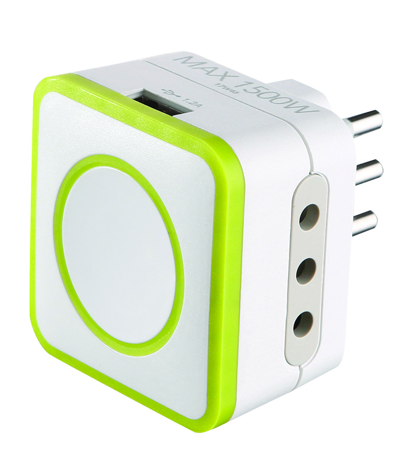 Gummy adapter 2 10A outlets + 1 USB 1.2A. White and green. Use when traveling or at the office to charge electronic devices via outlets and USB. Packaging: Blister