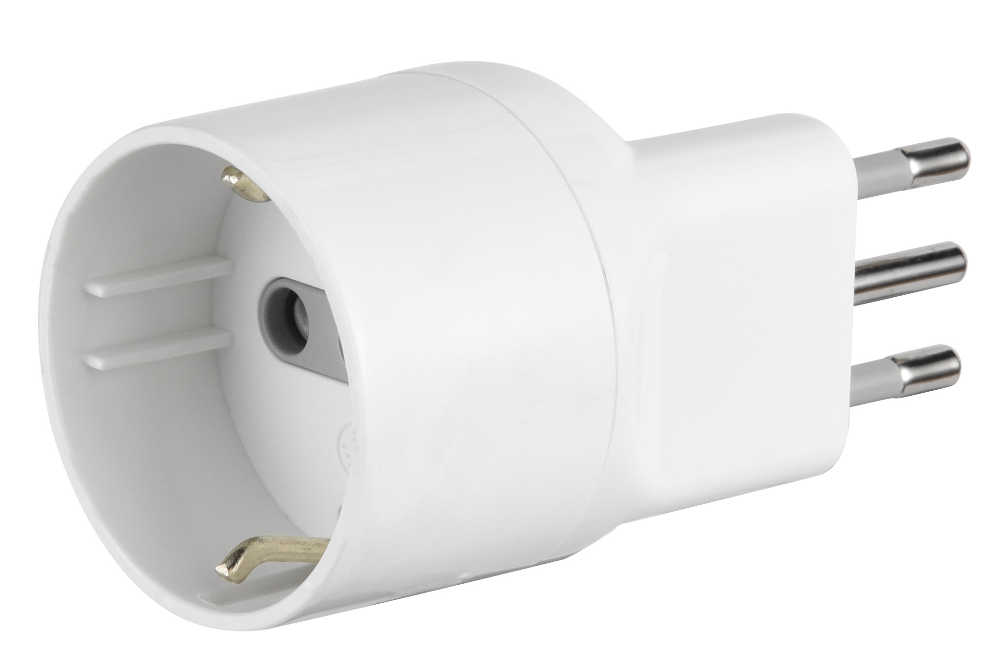 German 10A plug adapter to Italian 10A plug. offset. White. Use electronic devices with German plug in Italian outlets without additional adapters. Packaging: Label. bulk