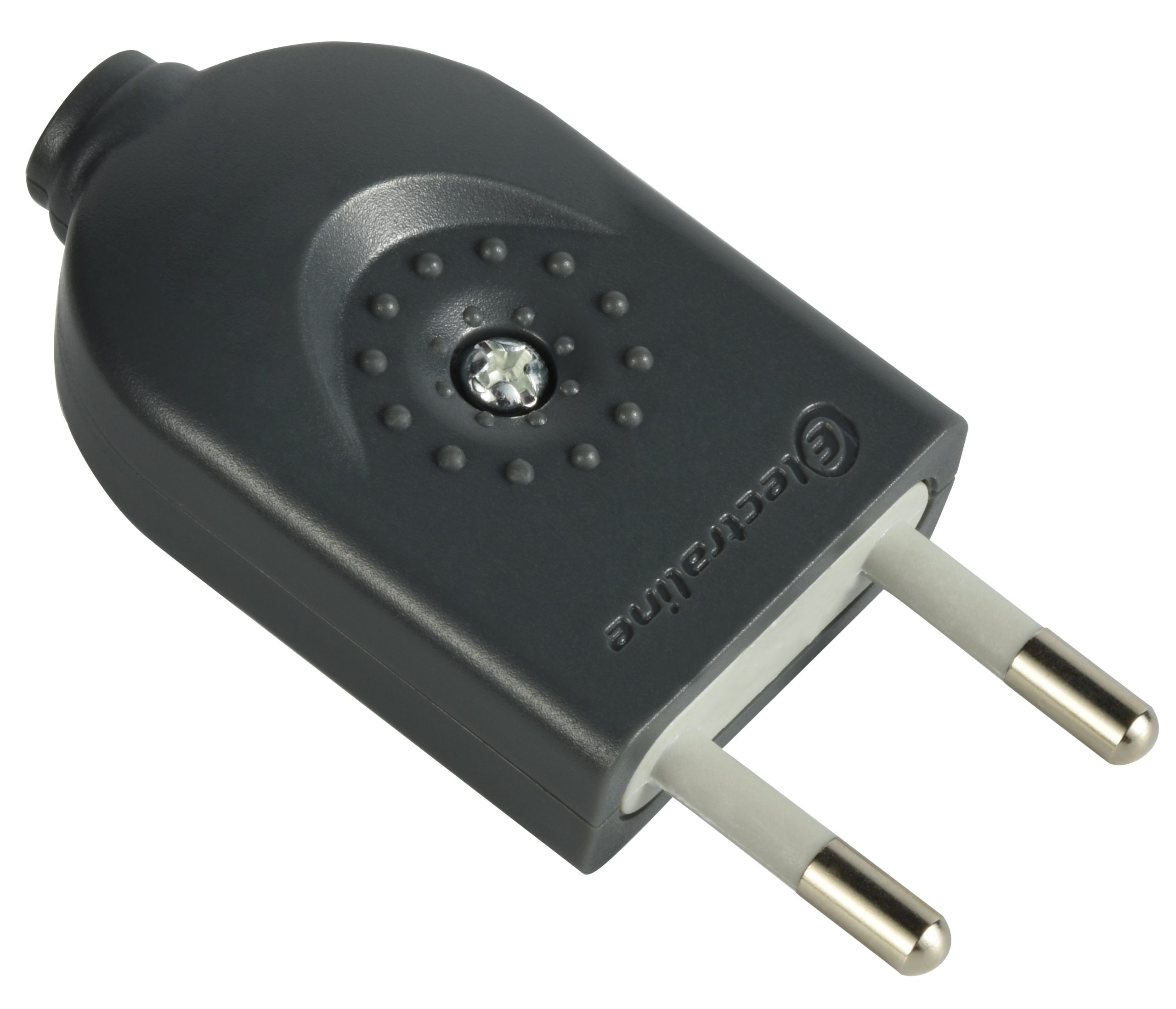 2-pin 10A straight plug. Gray. Ideal for use in domestic and industrial electrical applications requiring a 10A two-prong straight plug. Packaging: Label. bulk