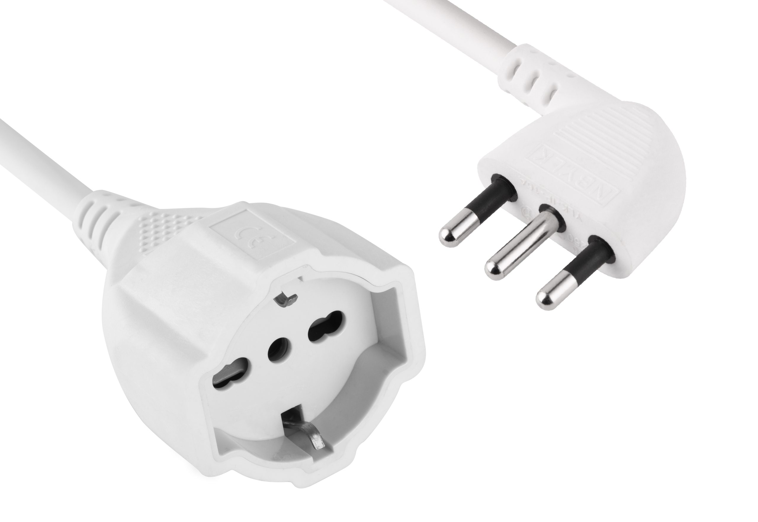 Space-saving mini extension cord. 10A plug. H05VV-F 3G0.75 -10A 50cm. White. Ideal for use in tight spaces where a 90° plug is needed. supporting a current load up to 10A. Packaging: Hanging labels