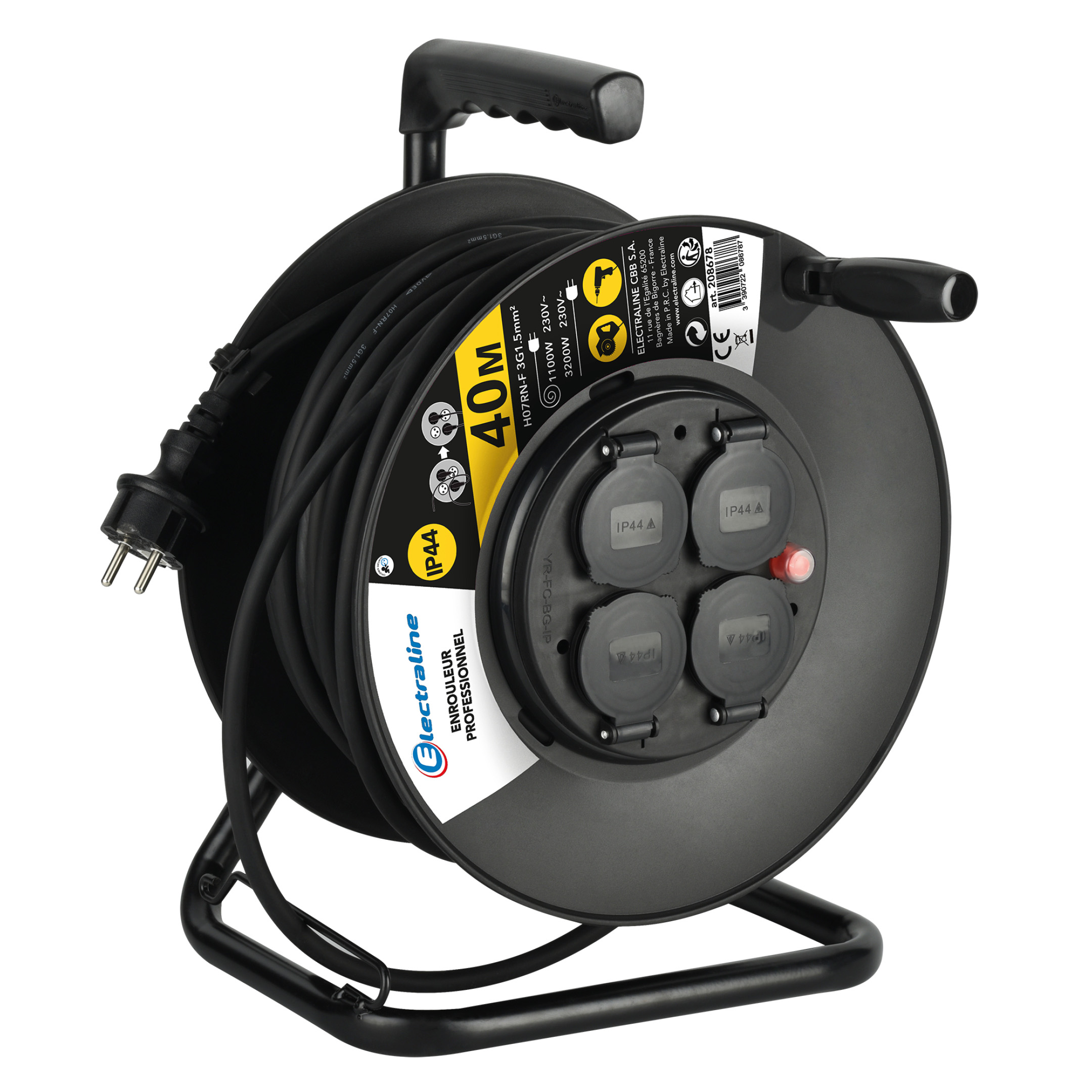 Enrouleur Pro-Line. 40m. 4 prises IP44. platine fixe. H07RN-F. 3G1.5. Noir. Emballage : Boîte.