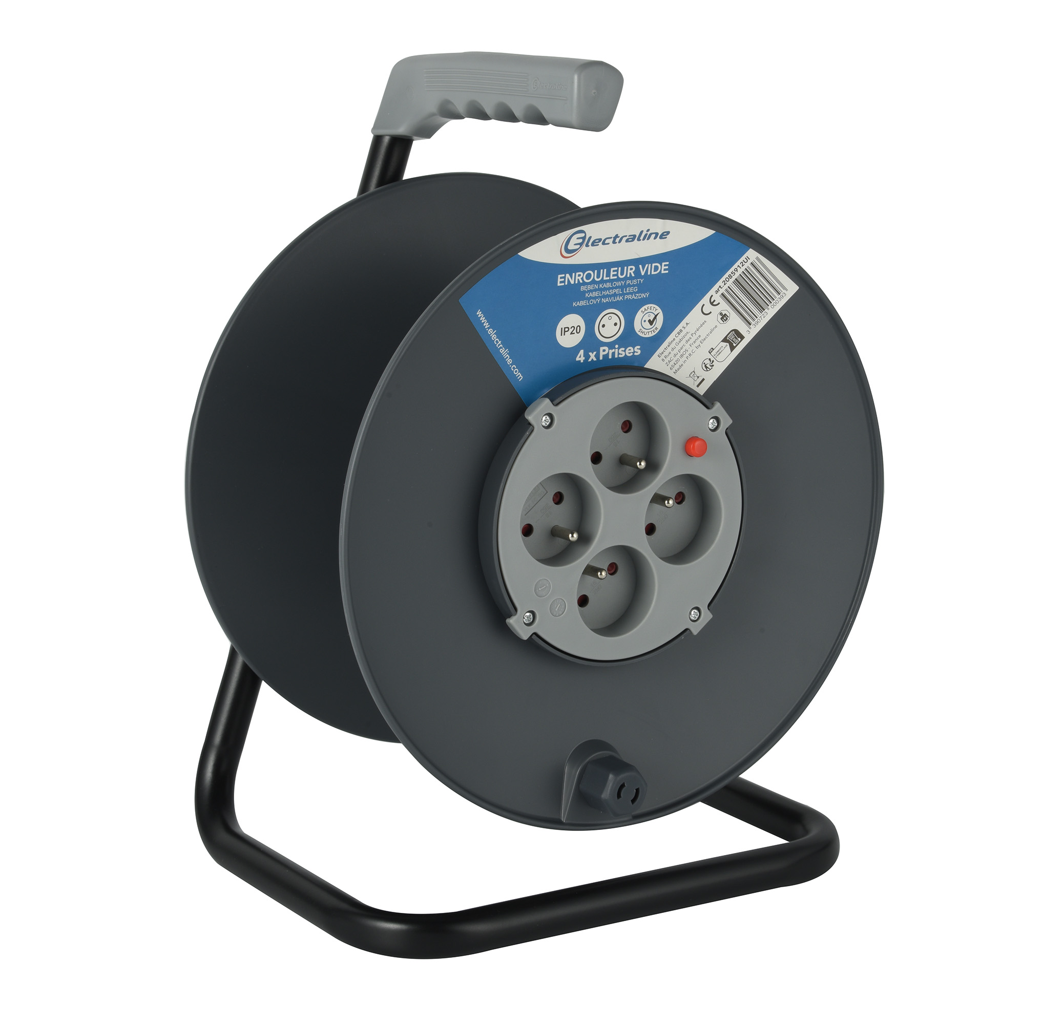 Enrouleur Brico-Line. vide. 4 prises. Noir / Gris. Emballage : Boite.