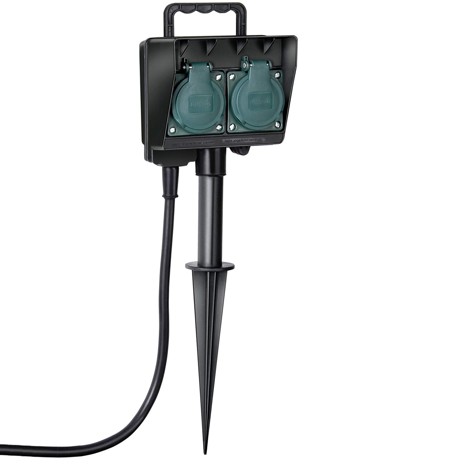 Piquet de jardin. 2 prises 2P+T 16A. 10m. IP44. Noir / Vert. Emballage : Boite.