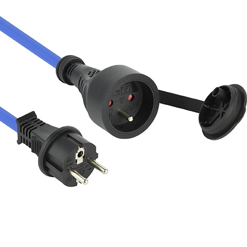 Prolongateur IP44. capuchon. 20m. N05V3V3-F 3G1.5. Bleu / Noir. Emballage : Film plastique. etiquette.