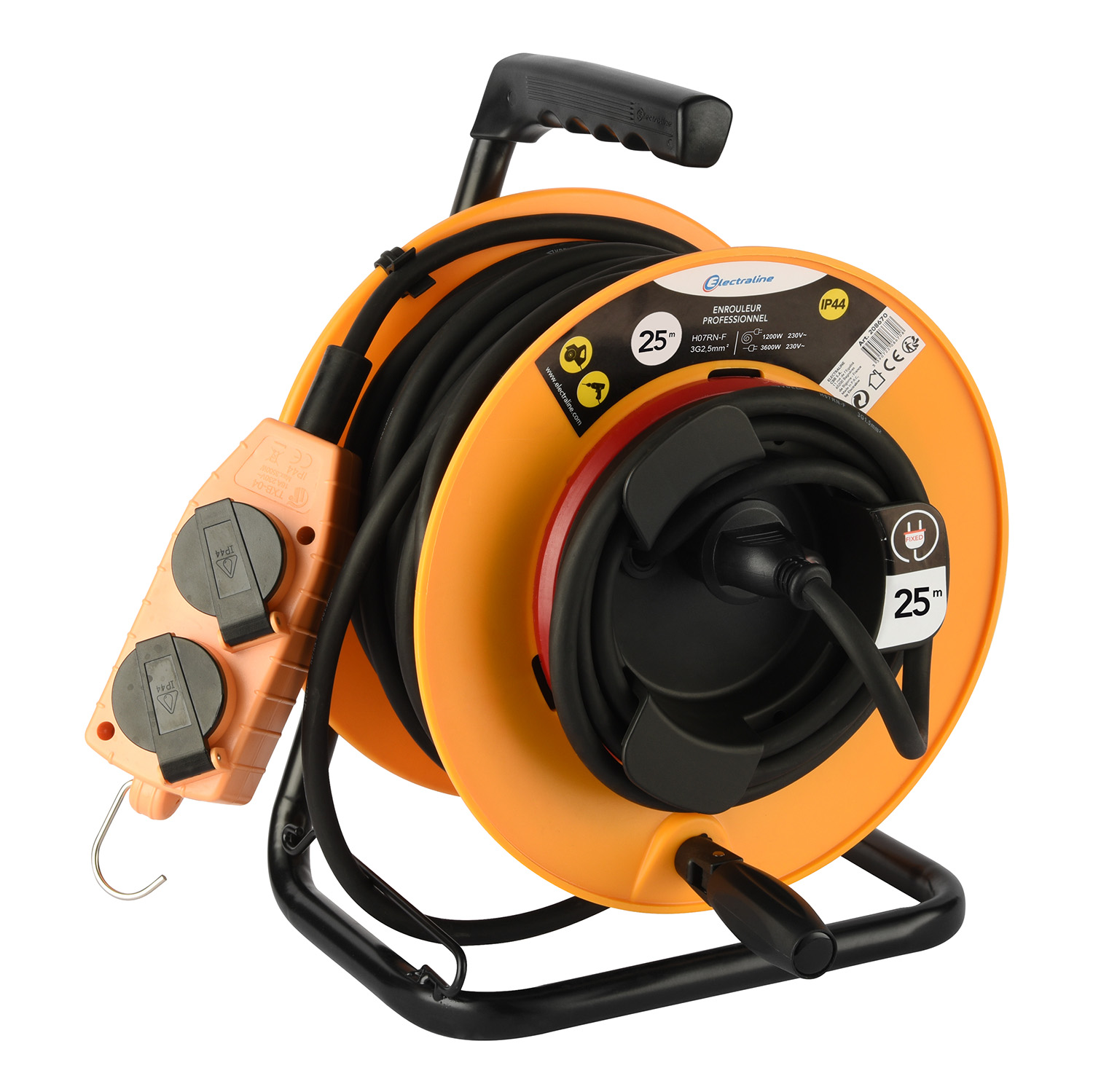 Enrouleur Professionnel. 4 prises. 25m. platine fixe. H07RN-F 3G2.5. IP44. Jaune. Emballage : Boîte.