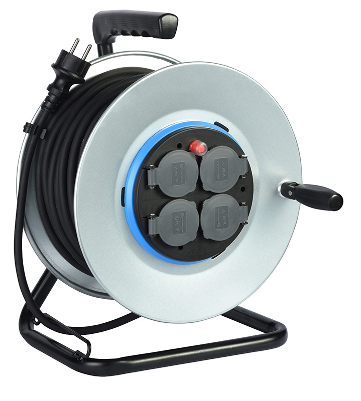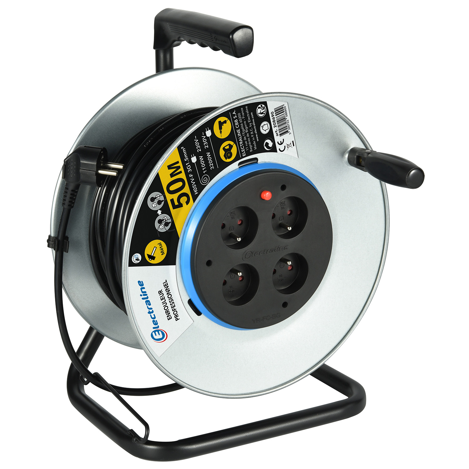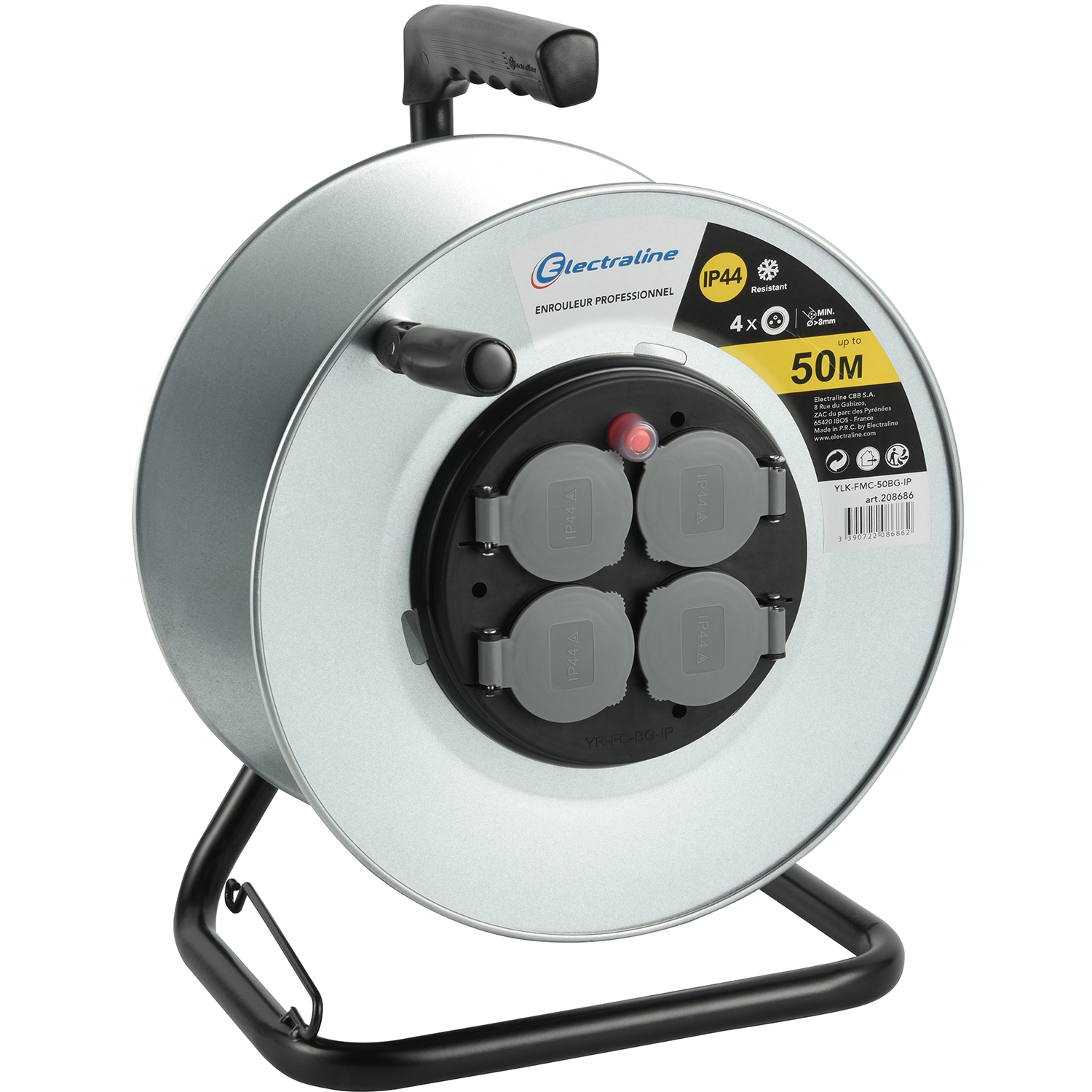 Enrouleur Metal Pro-Line. 40m. 4 prises IP44. platine fixe. H07RN-F 3G2.5. Alu. Emballage : Boîte.
