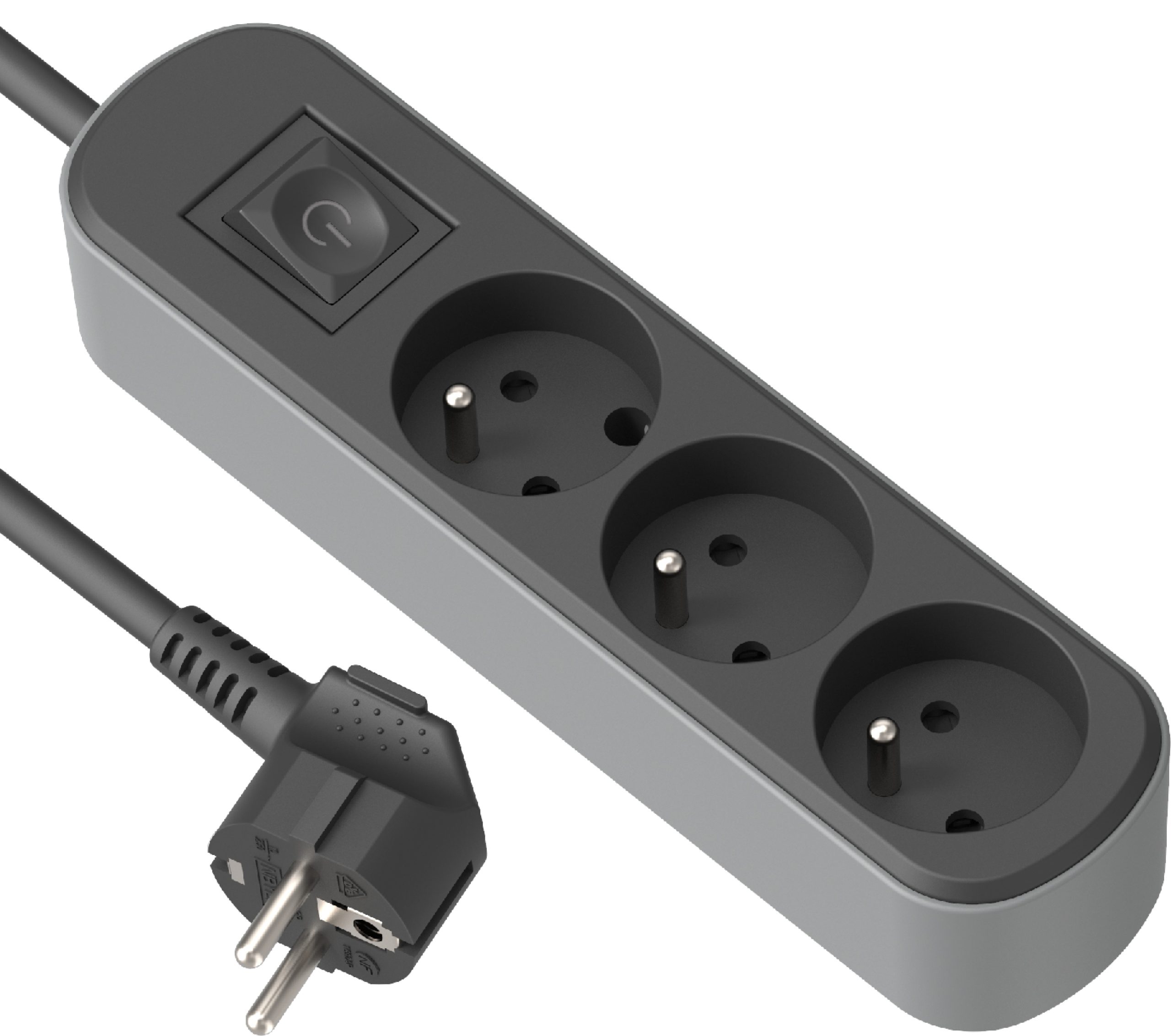 Bloc multiprise avec interr. gamme Prima. 3 prises. 3m. H05VV-F 3G1.5. Noir / Gris. Hanging label. Emballage : Etiquette brochable.