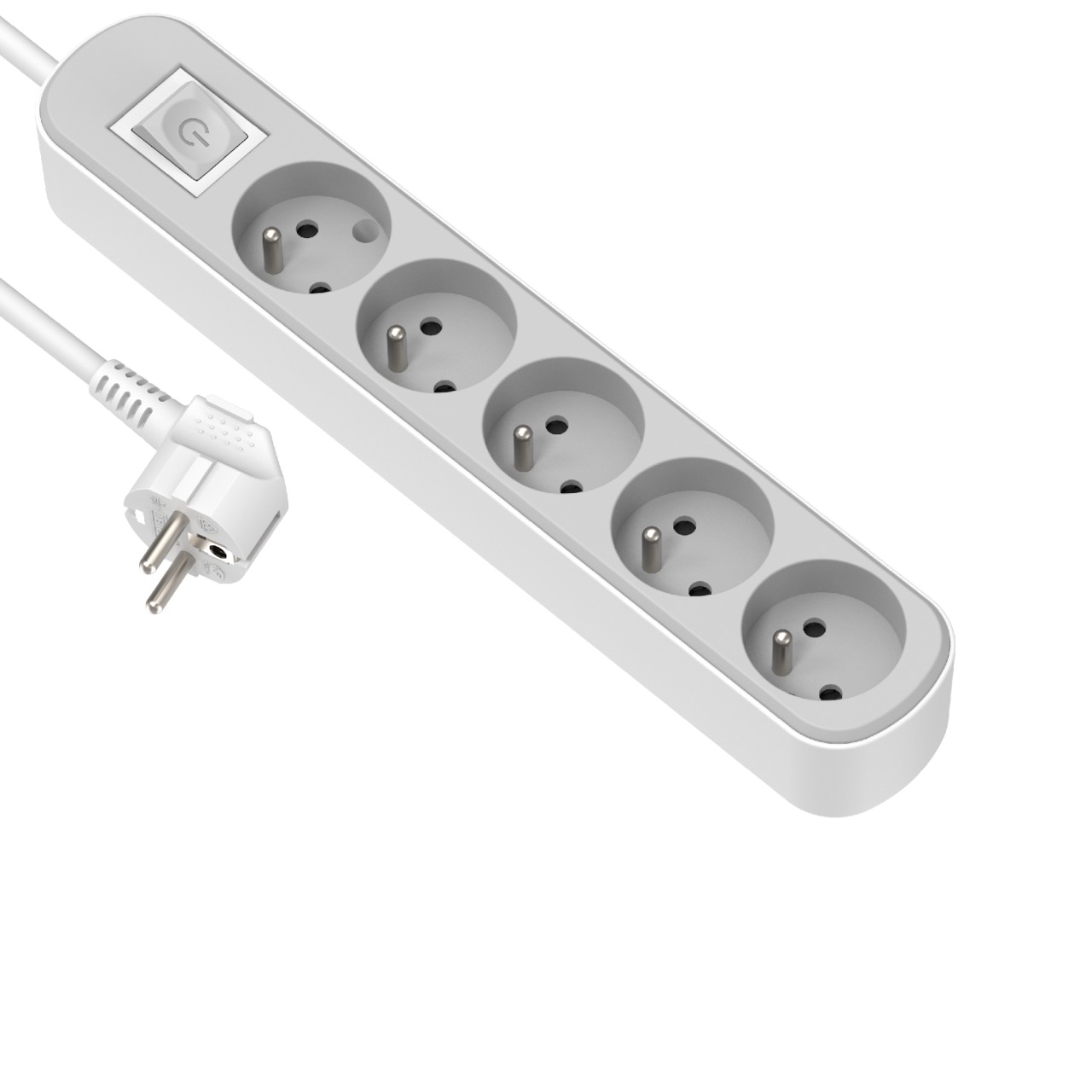 Bloc multiprise avec interr. gamme Prima. 5 prises. 1.5m. H05VV-F 3G1. Blanc / Gris. Hanging label. Emballage : Etiquette brochable.
