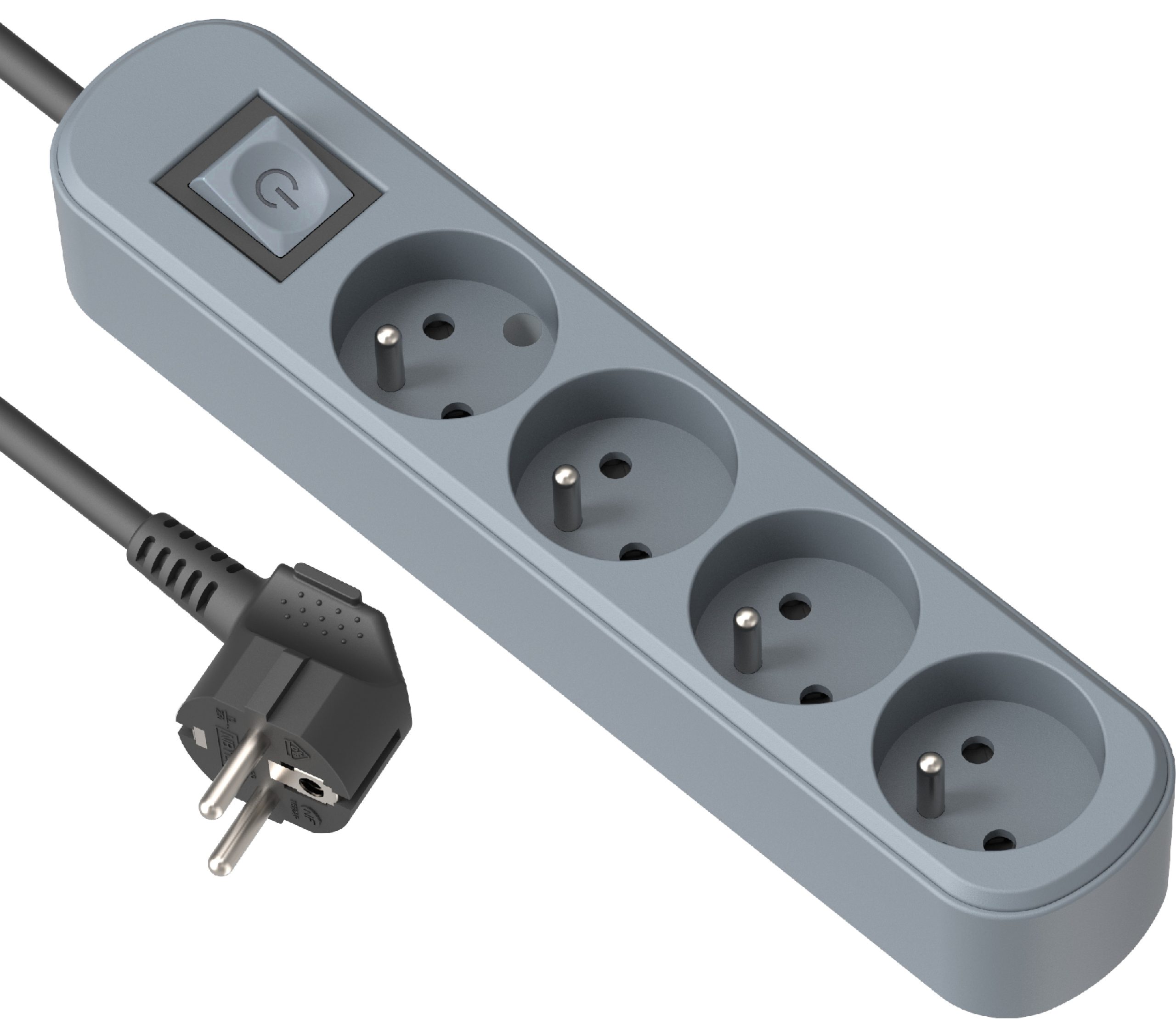 Bloc multiprise avec interr. gamme Prima. 3 prises. 1.5m. H05VV-F 3G1. Noir / Gris. Hanging label. Emballage : Etiquette brochable.