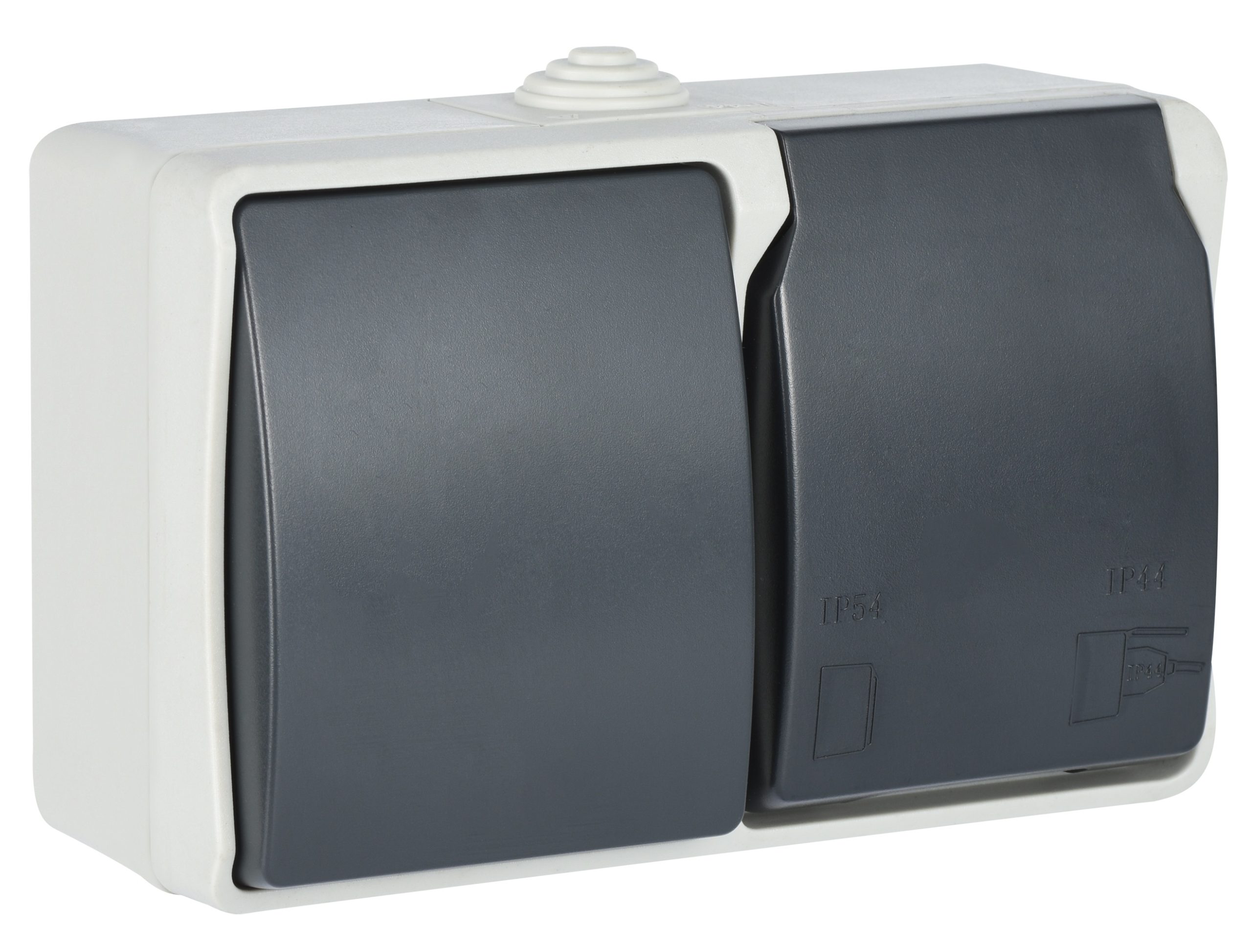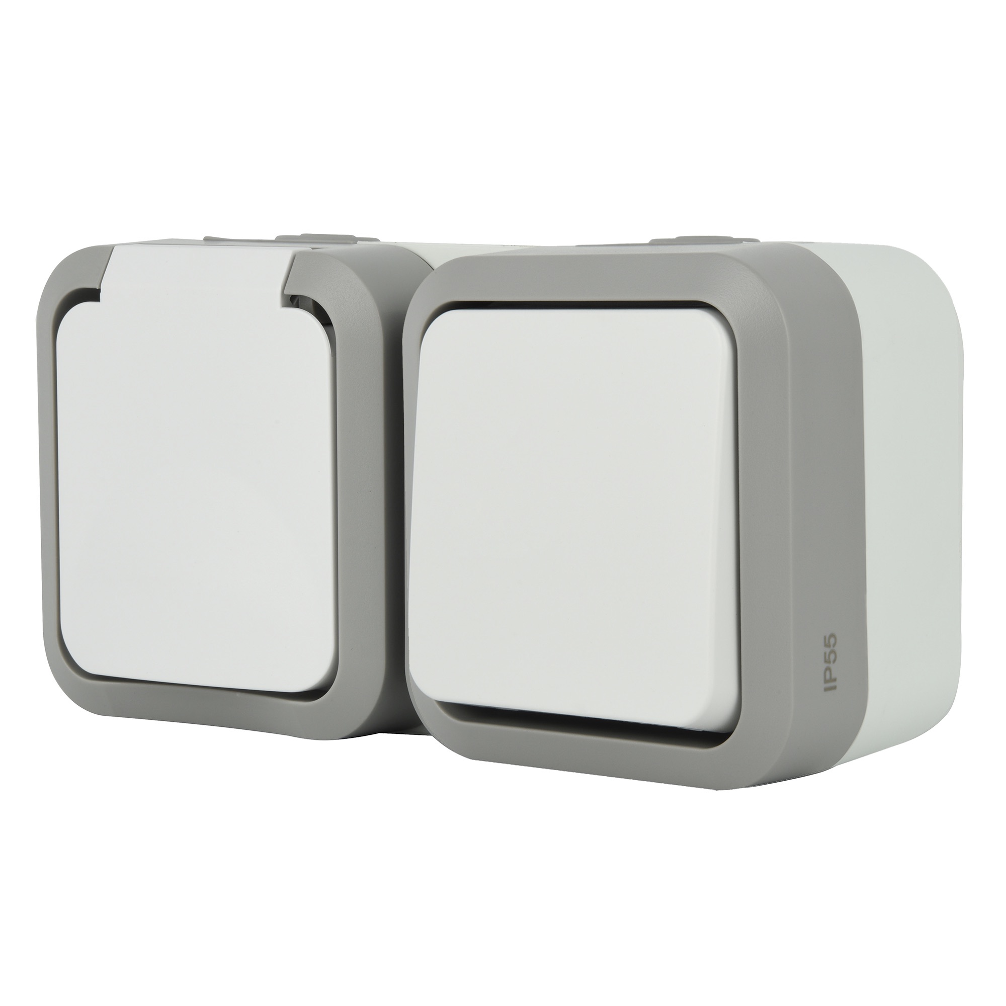 Prise 2P+T + Interrupteur V/V. IP55. gamme Hypro. Blanc / Gris. Emballage : Film plastique. etiquette.