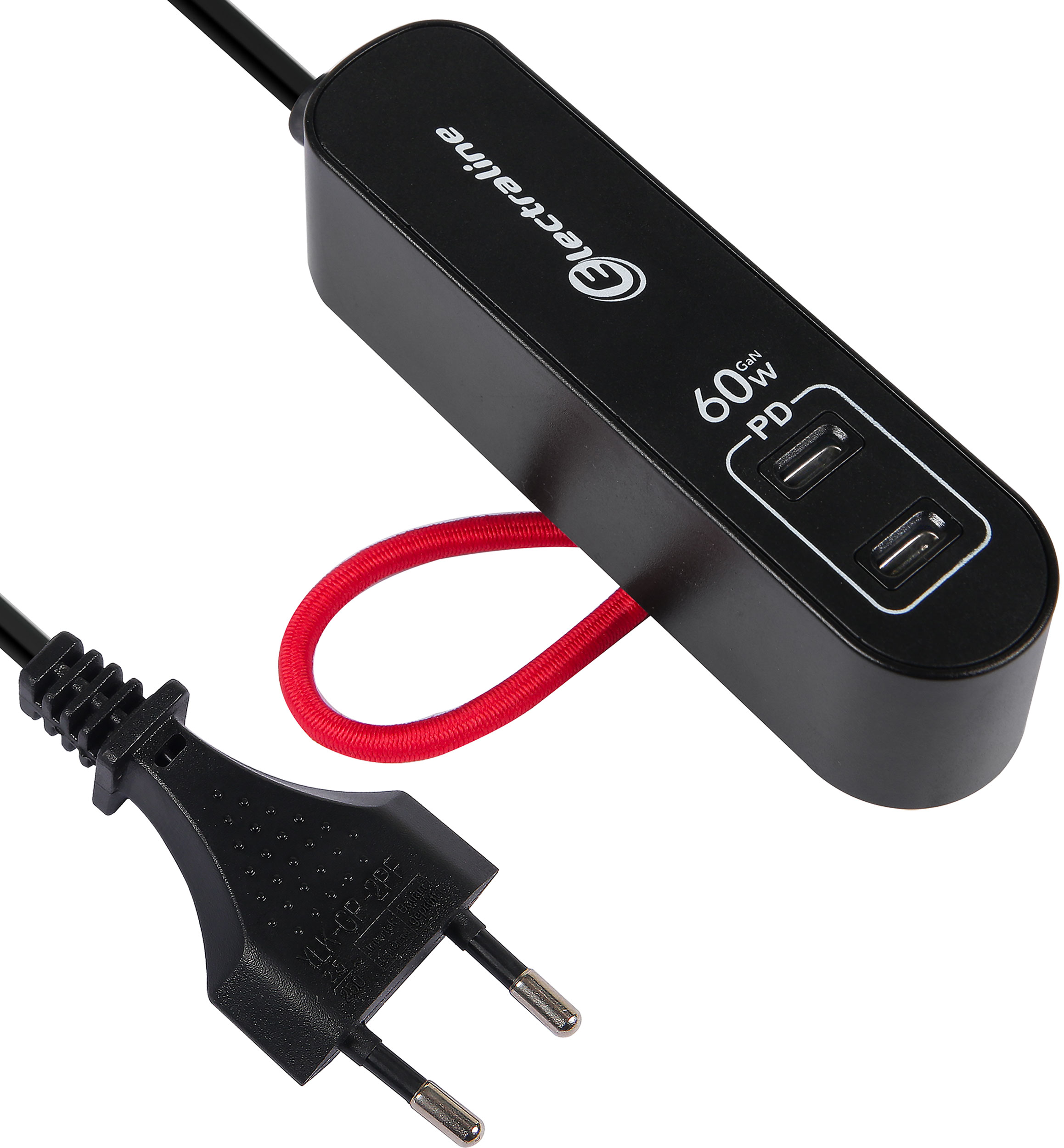 Prolongateur 2 USB-C 60W. Power Delivery. GaN tech. boucle elastique. H03VVH2-F 2X0.75. Noir. Emballage : Boite suspendue.