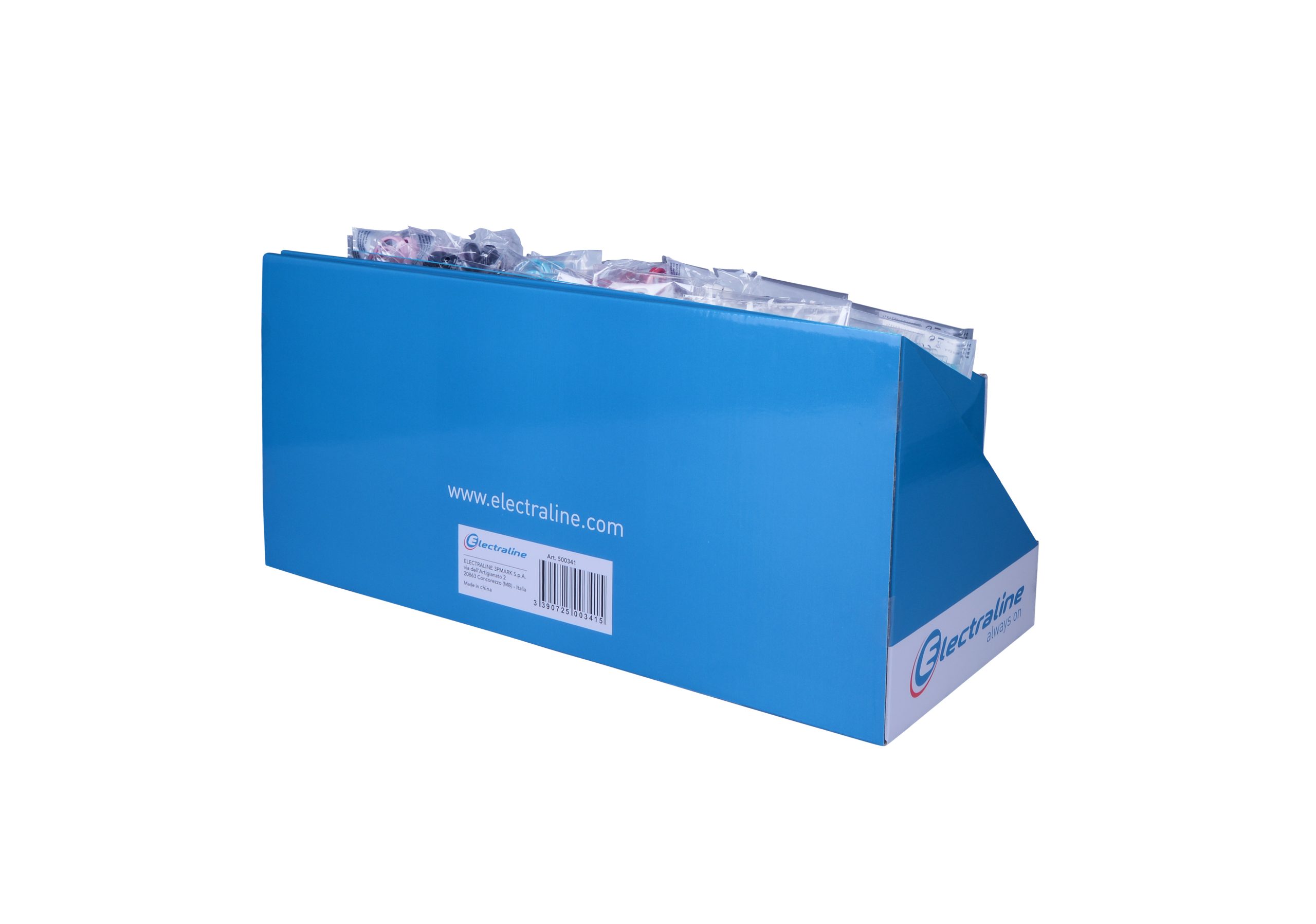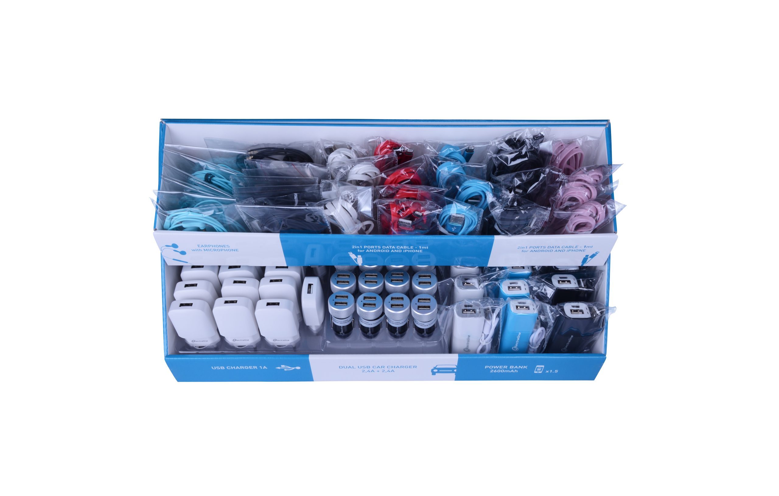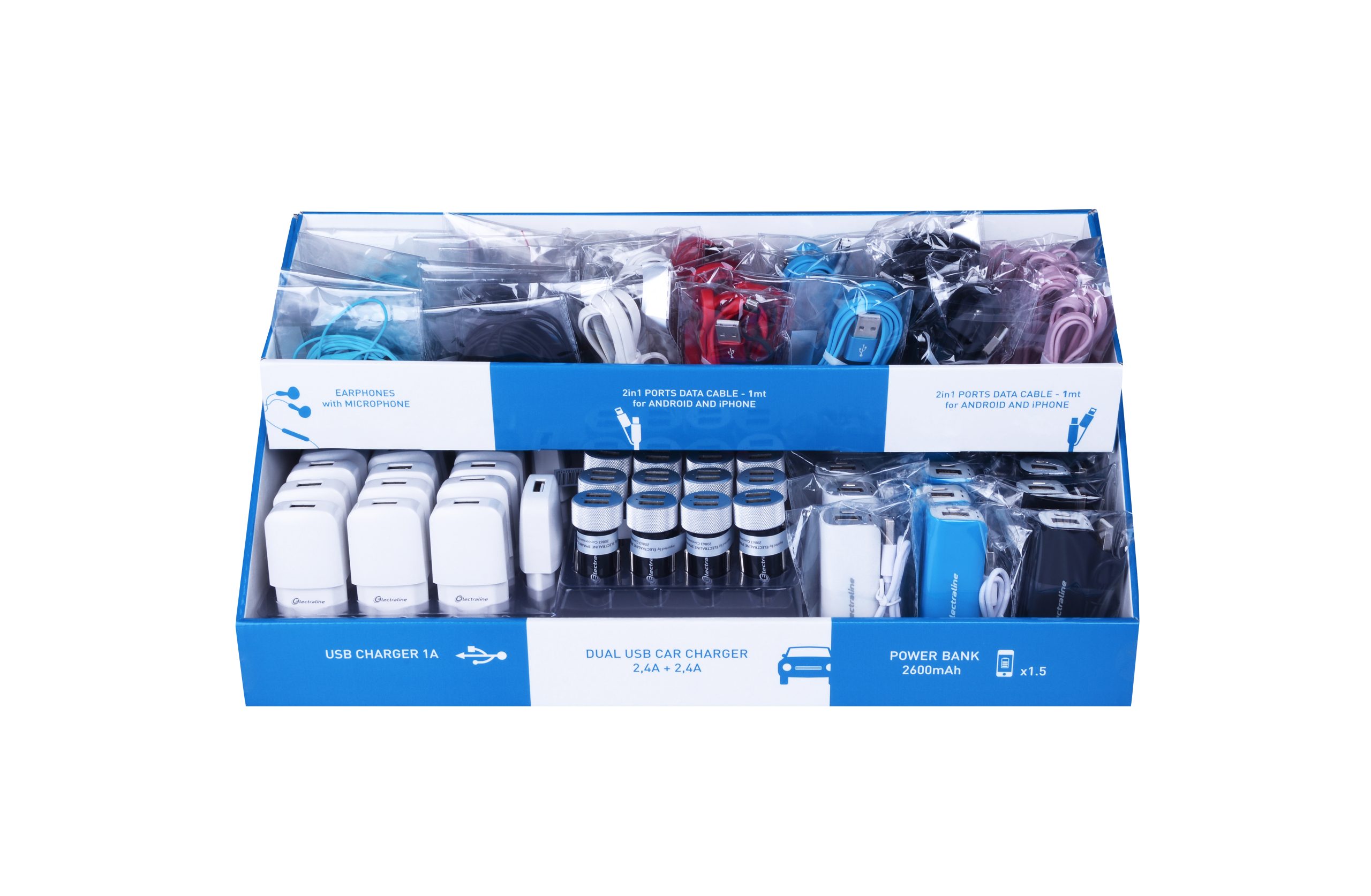 Boîte 20 Câble USB. 15 Powerbank 2600mah. 20 adapt. allumes cigares. 12 écouteurs. 20 chargeurs USB. 18x21x44cm. Blanc / bleu. Emballage : Boite.