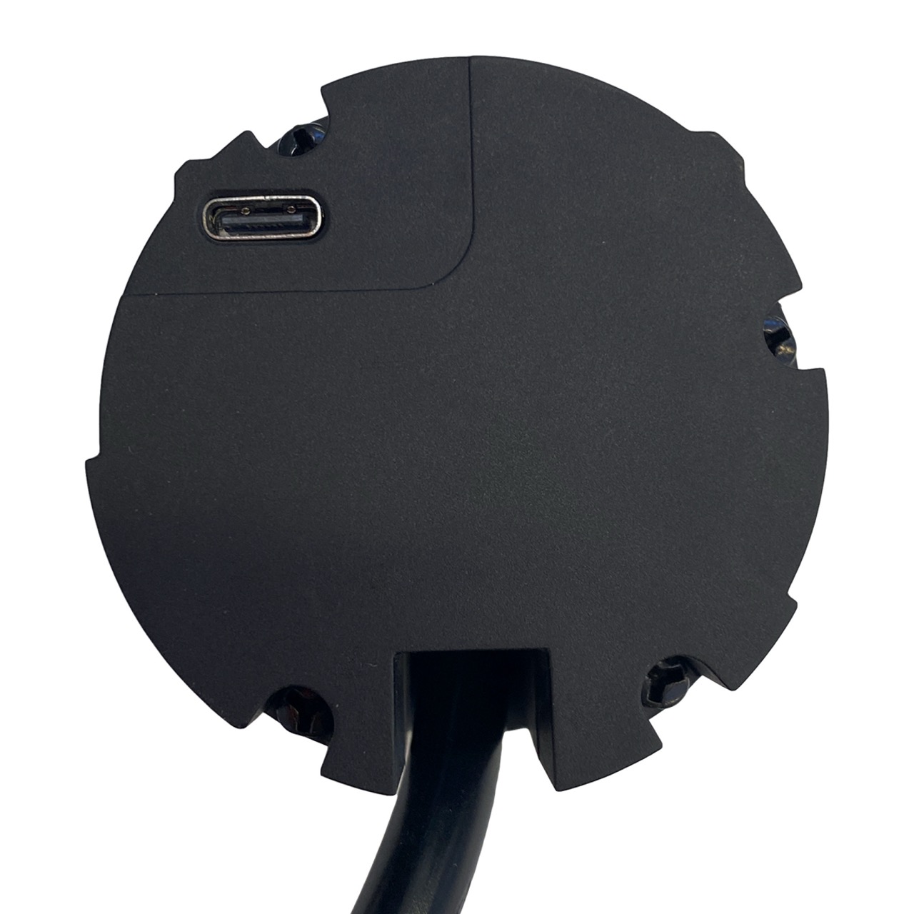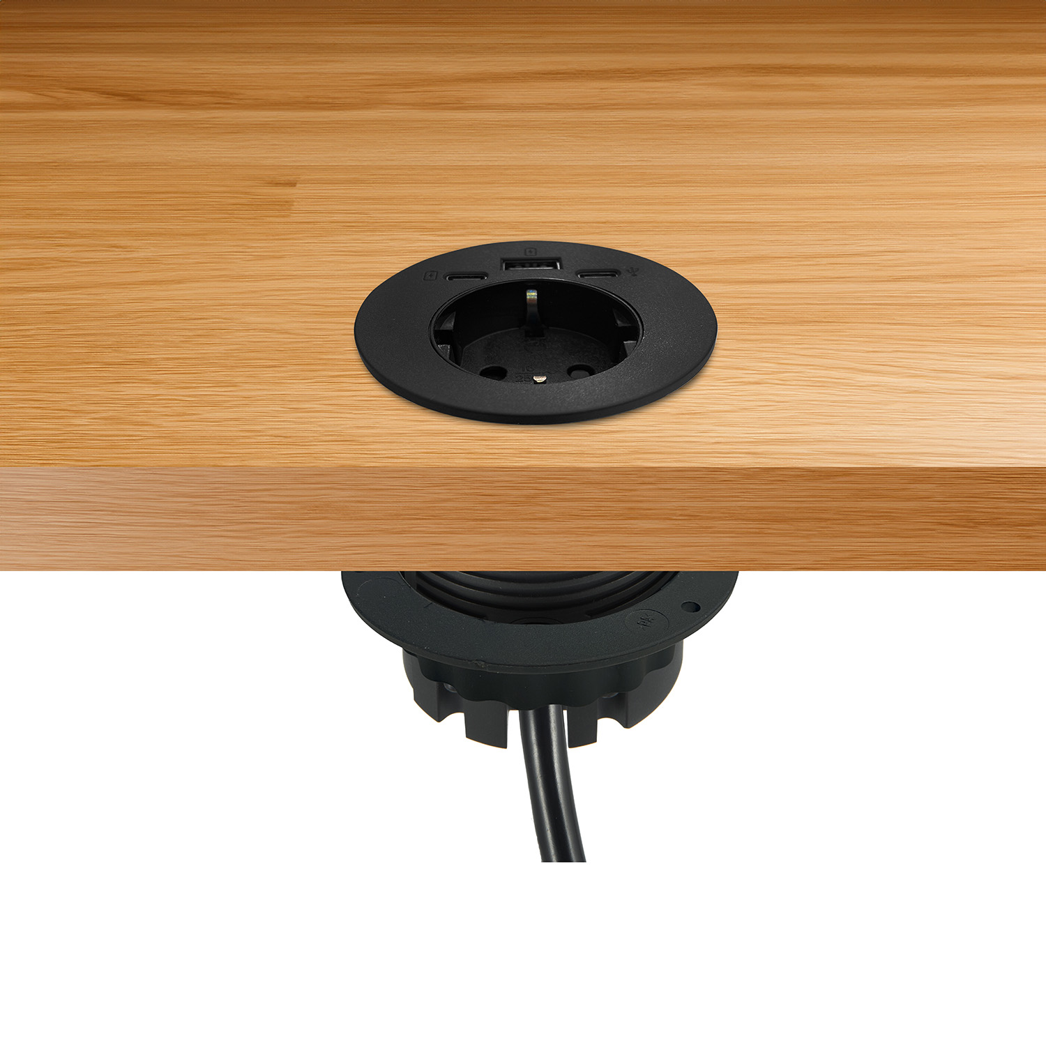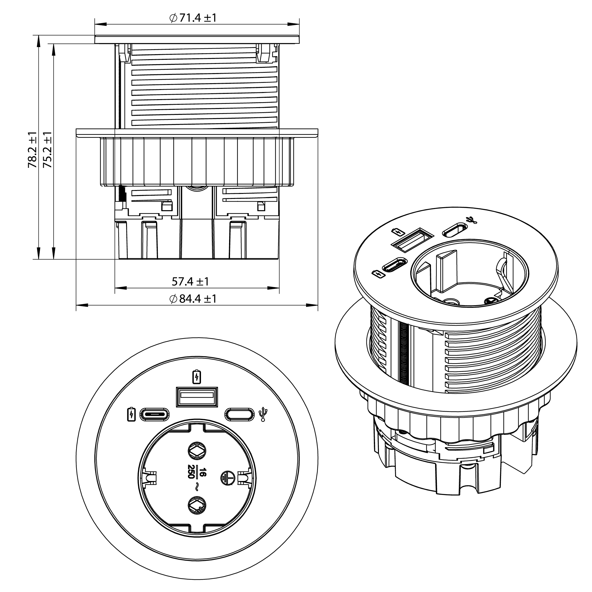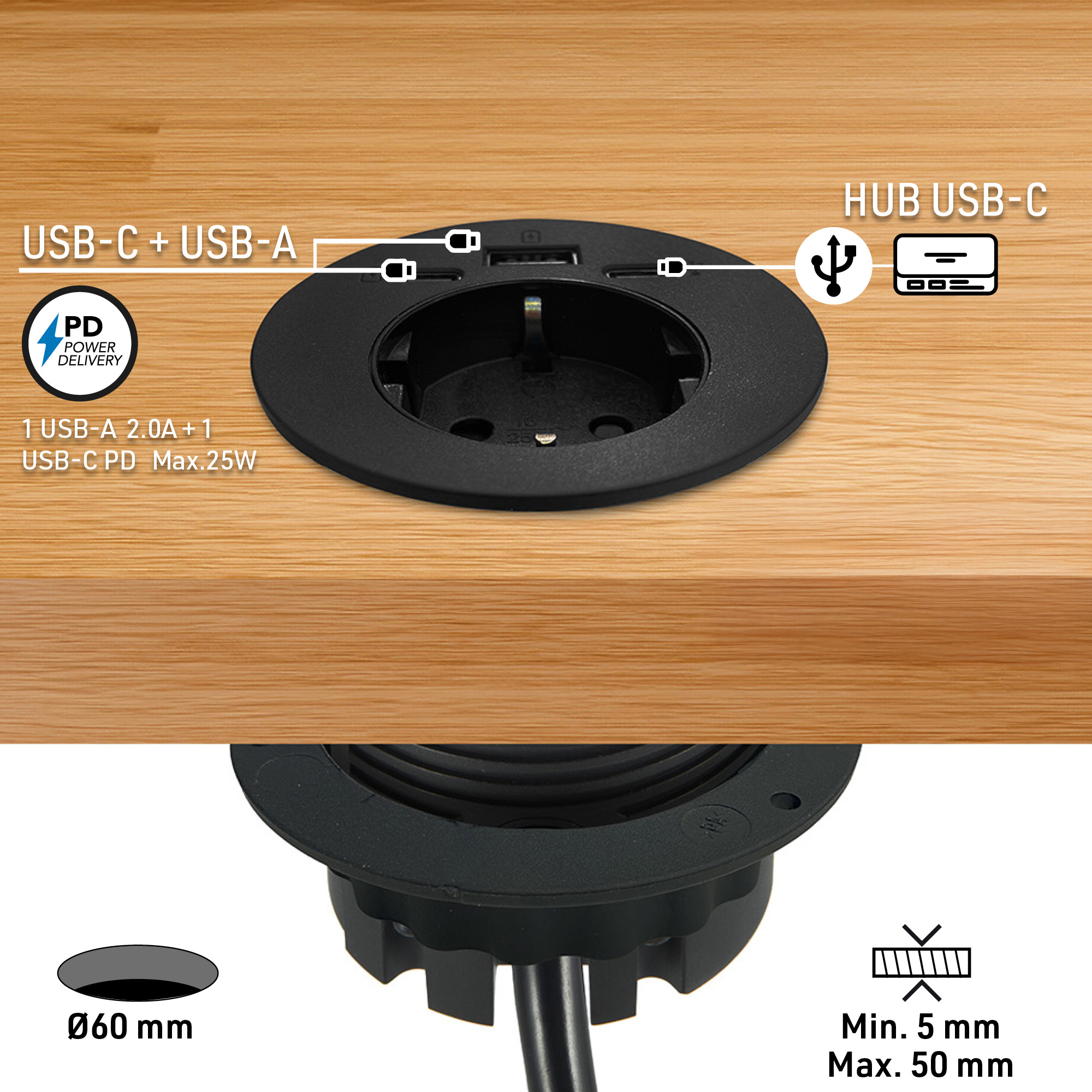 Bloc multiprise encastrable. rond. 1 prise Schuko + USB-A + 2 USB-C data et recharge 25W. H05VV-F 3G1.5. 2m. Black. Emballage : Boite suspendue.