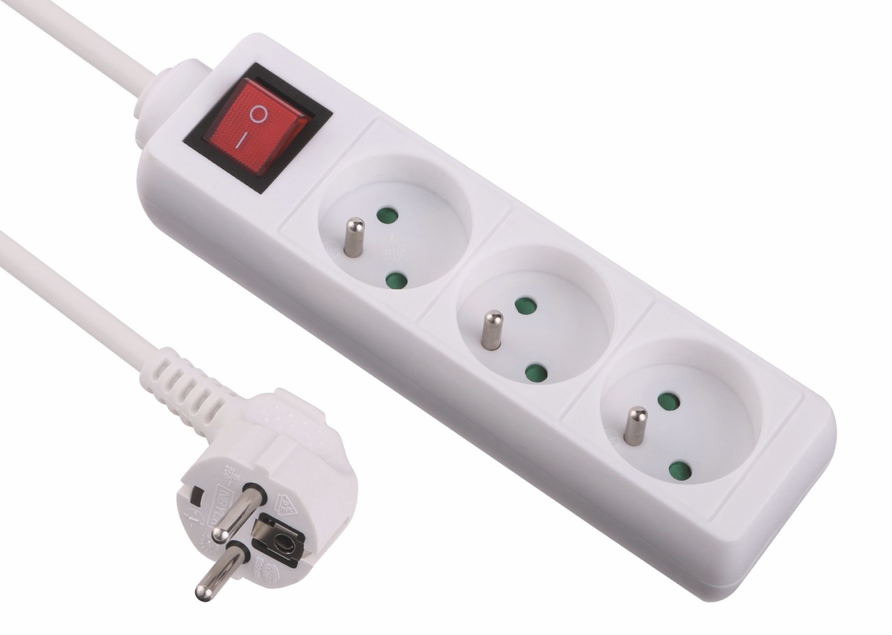 Bloc multiprise avec interr. gamme Prima. 3 prises. 1.5m. H05VV-F 3G1. Blanc / Gris. Hanging label. Emballage : Etiquette brochable.