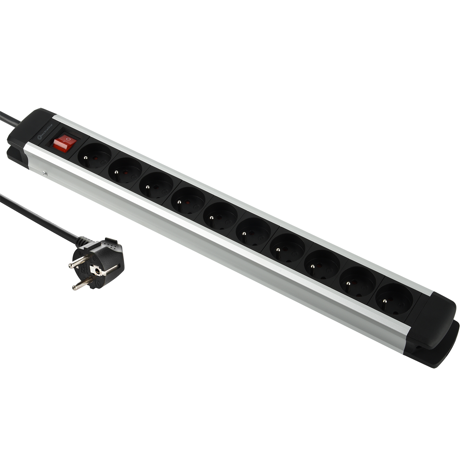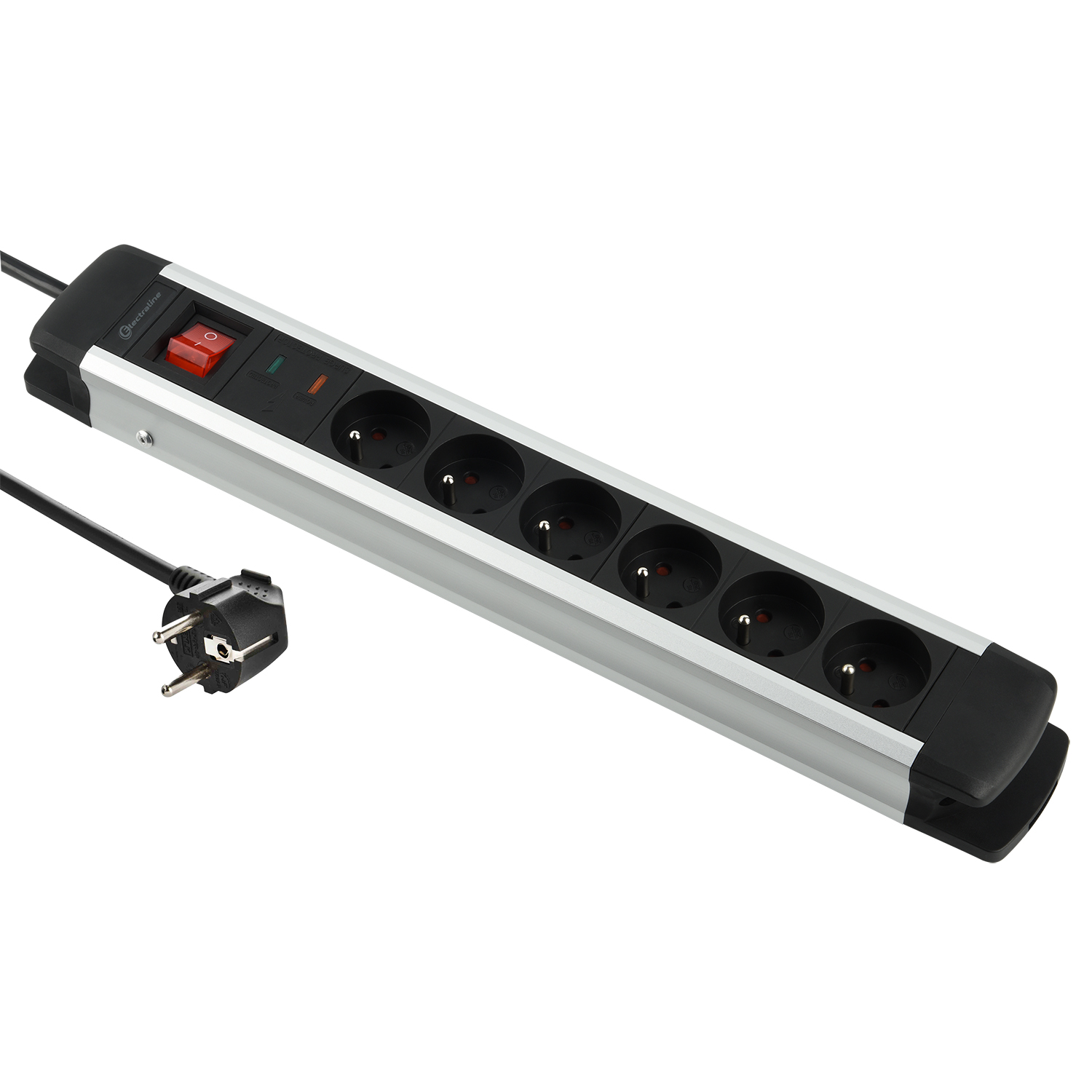 Bloc multiprise avec interr. gamme Prima. 5 prises. 3m. H05VV-F 3G1.5. Noir / Gris. Hanging label. Emballage : Etiquette brochable.