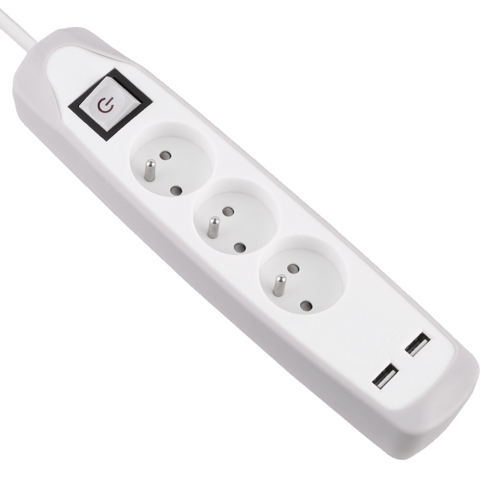 Prolongateur 2m. USB-A 3.5A + USB-C. H03VVH2-F 2X0.5. blister. Blanc / Gris. Emballage : Blister.