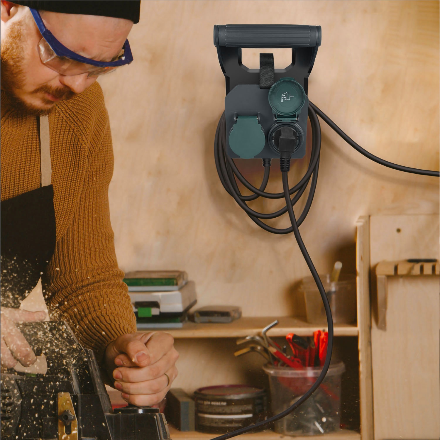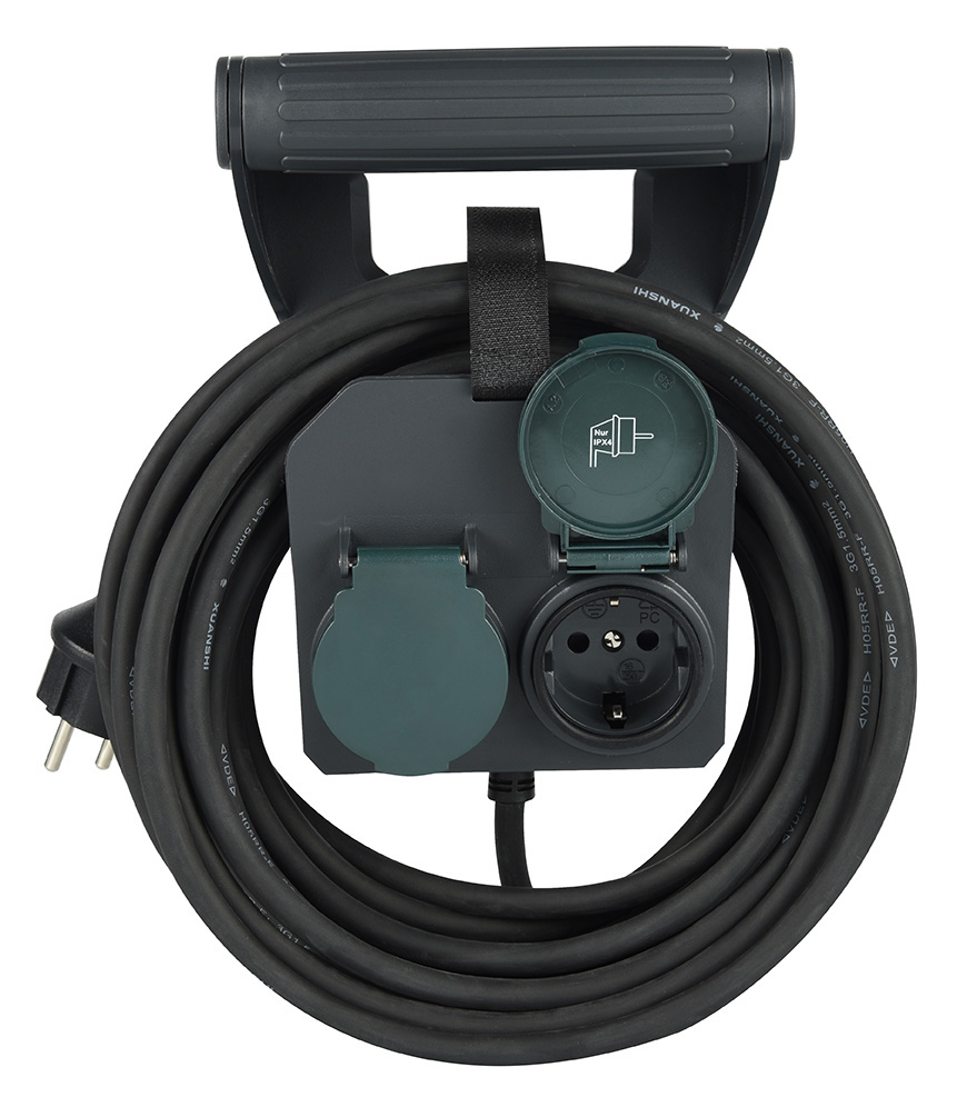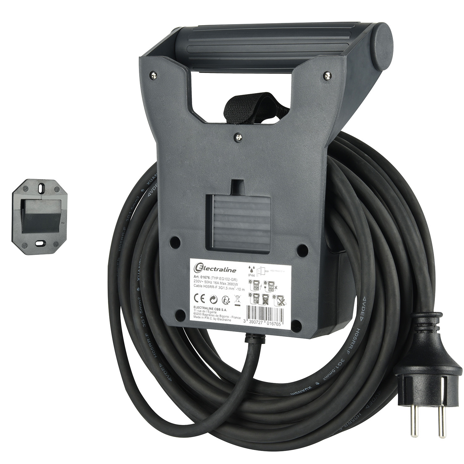 Prolunga con sistema di avvolgiprolunga integrato e maniglia. IP44. 2 prese. 10m H05RR-F 3G1.5. Nero. Ideale per utilizzi allaperto come giardini. cortili e cantieri. offrendo praticità e sicurezza con 2 prese e 10m di lunghezza. Imballo: Etichetta