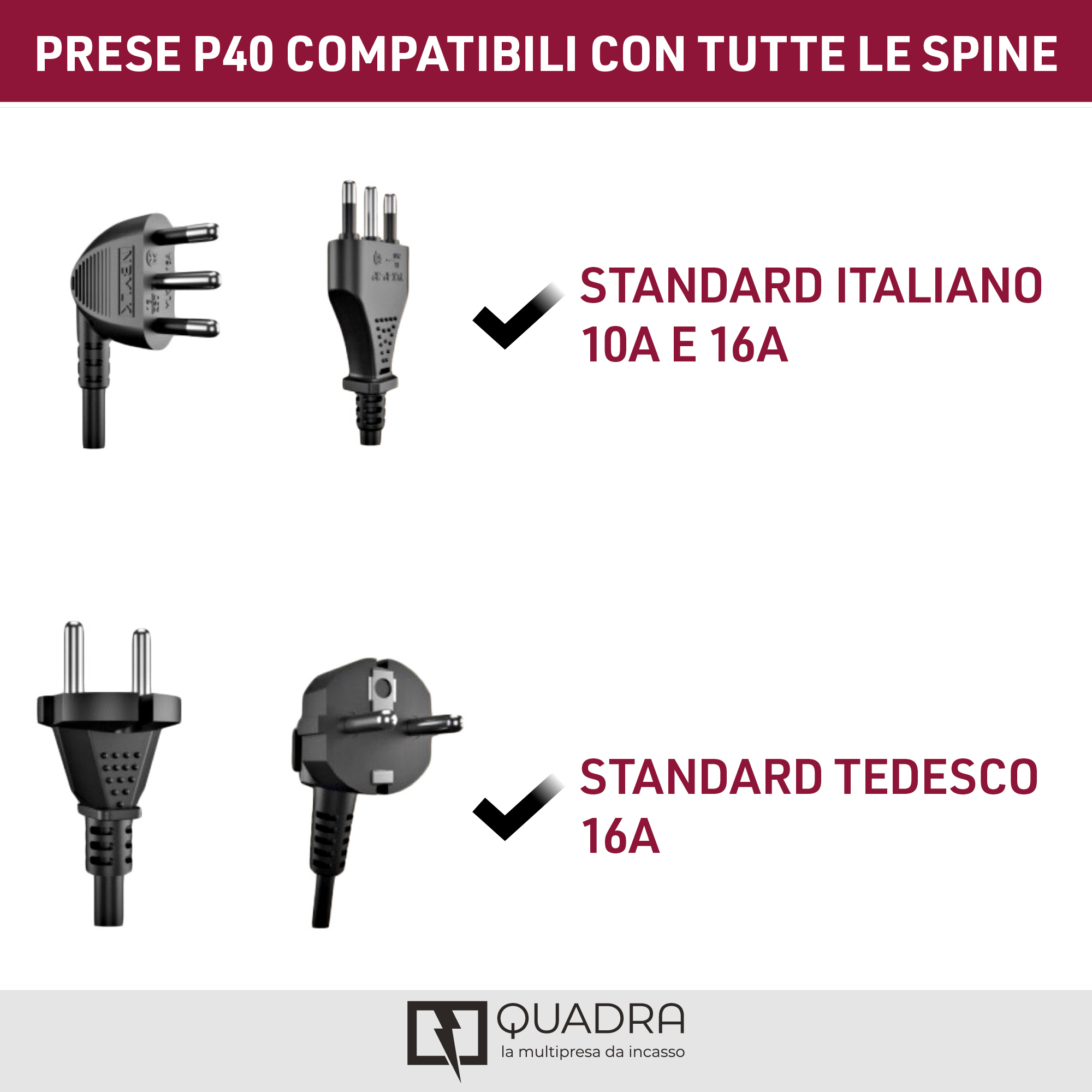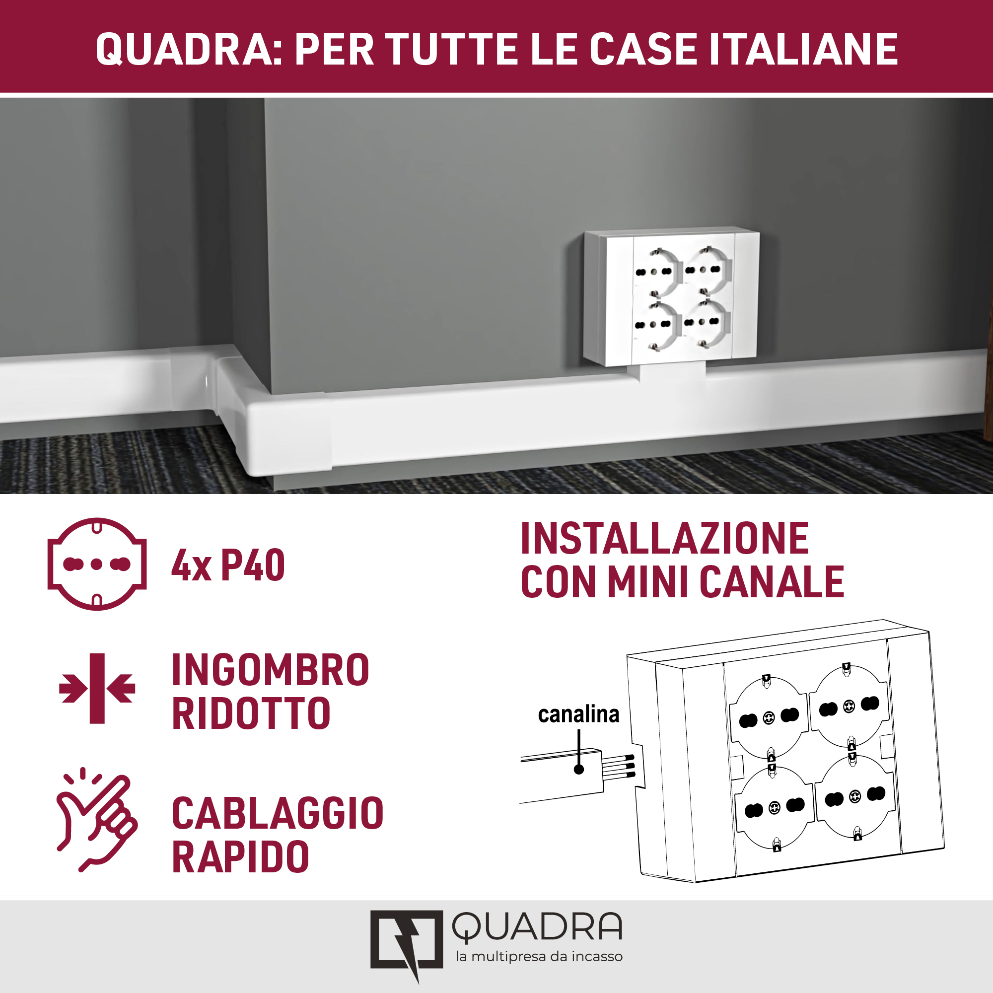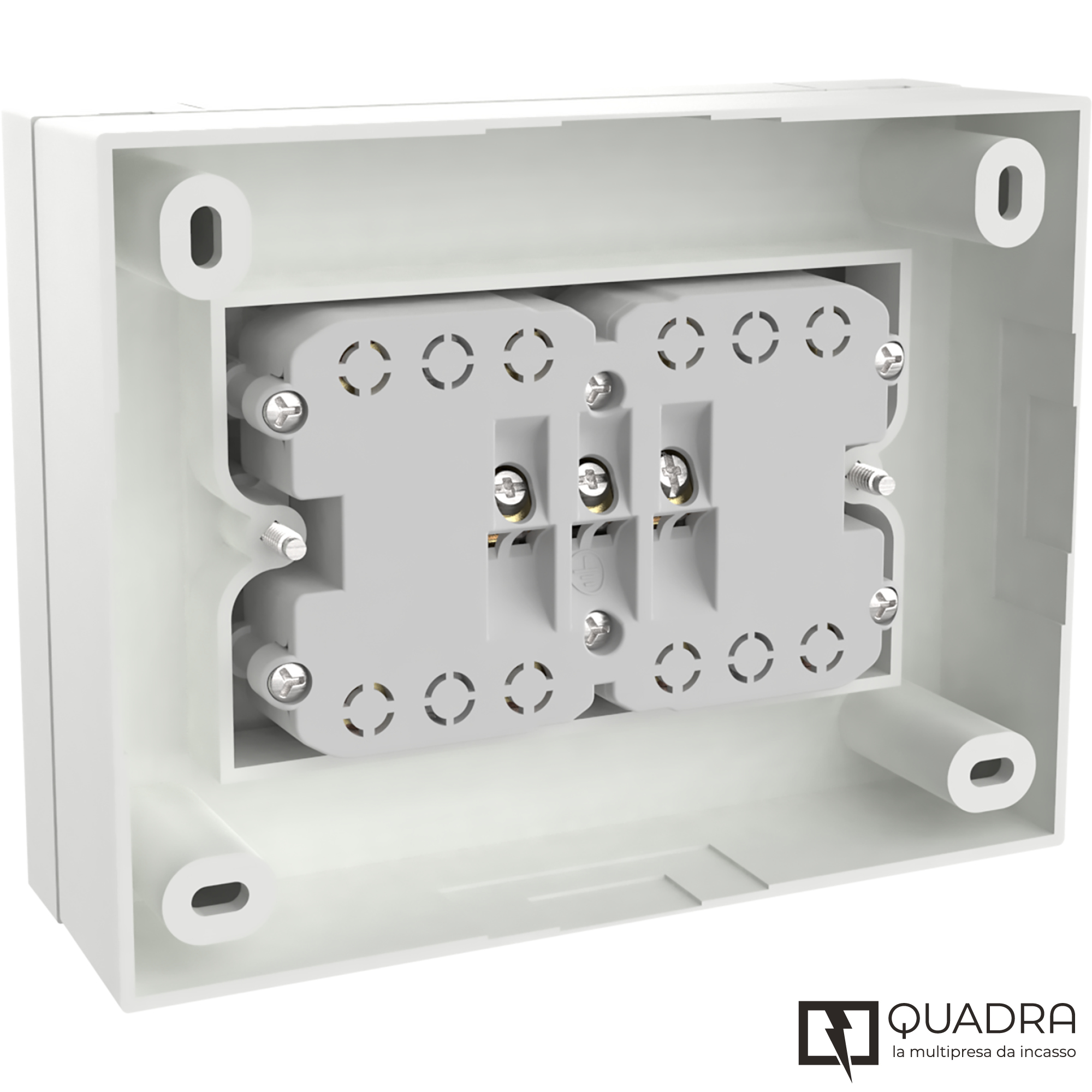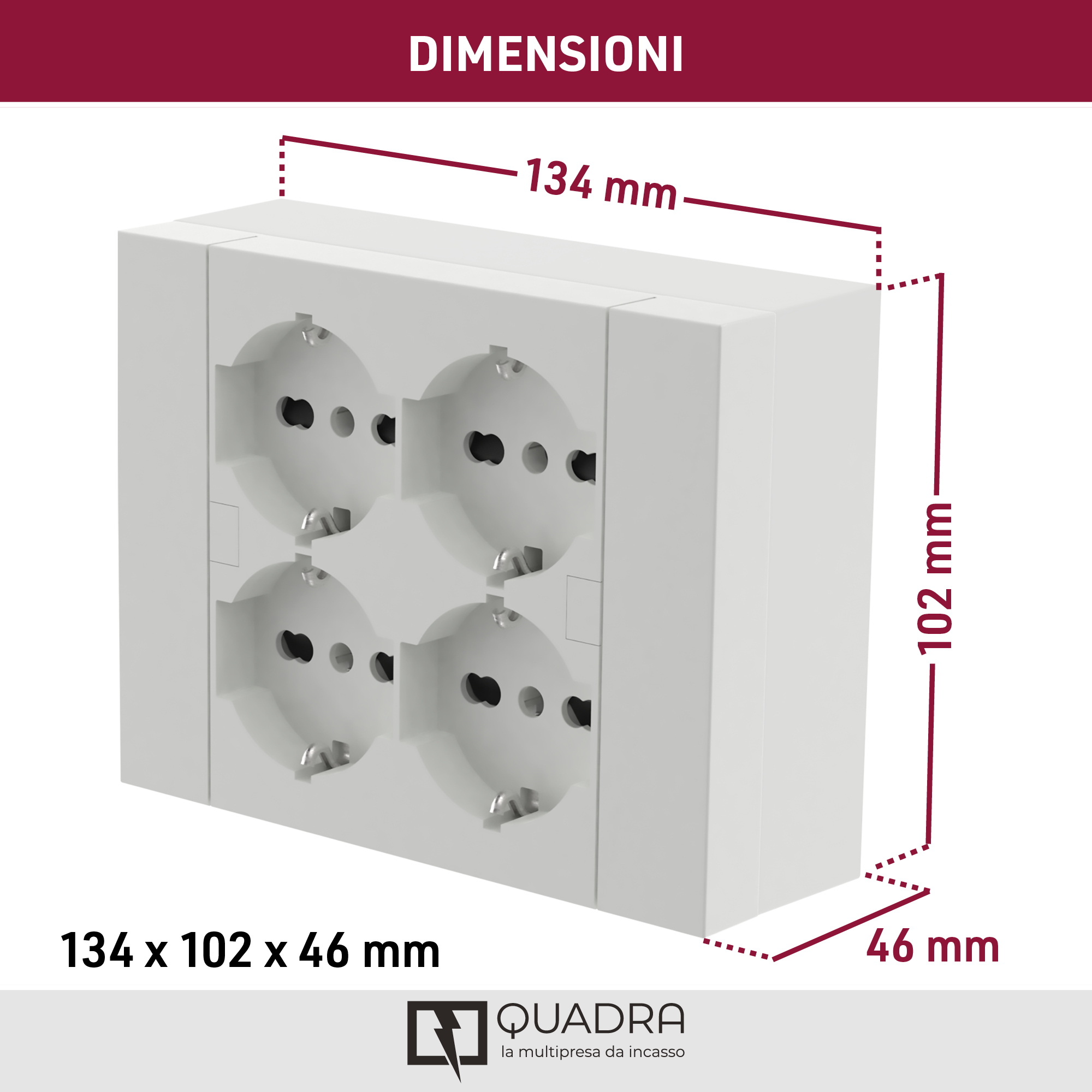 Multipresa da incasso Quadra. 4 prese universali P40. con scatola. Bianco. Ideale per uffici. cucine. sale conferenze e ambienti domestici che richiedono più prese e un design discreto. Imballo: Termo