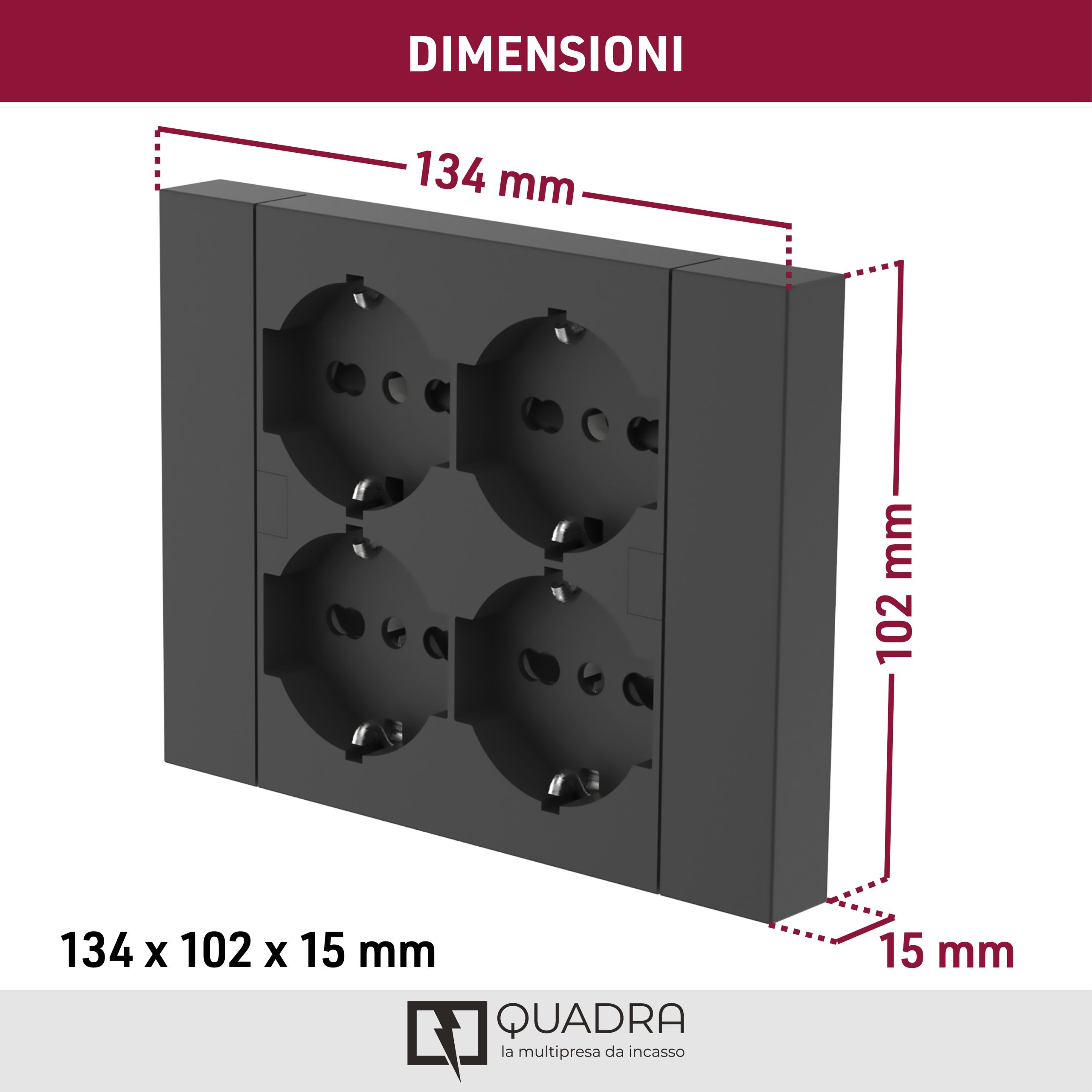 Multipresa da incasso Quadra. 4 prese universali P40. Nero. Ideale per uffici. cucine. sale conferenze e camere da letto per collegare dispositivi elettronici in modo pratico. Imballo: Sacchetto plastica appendibile