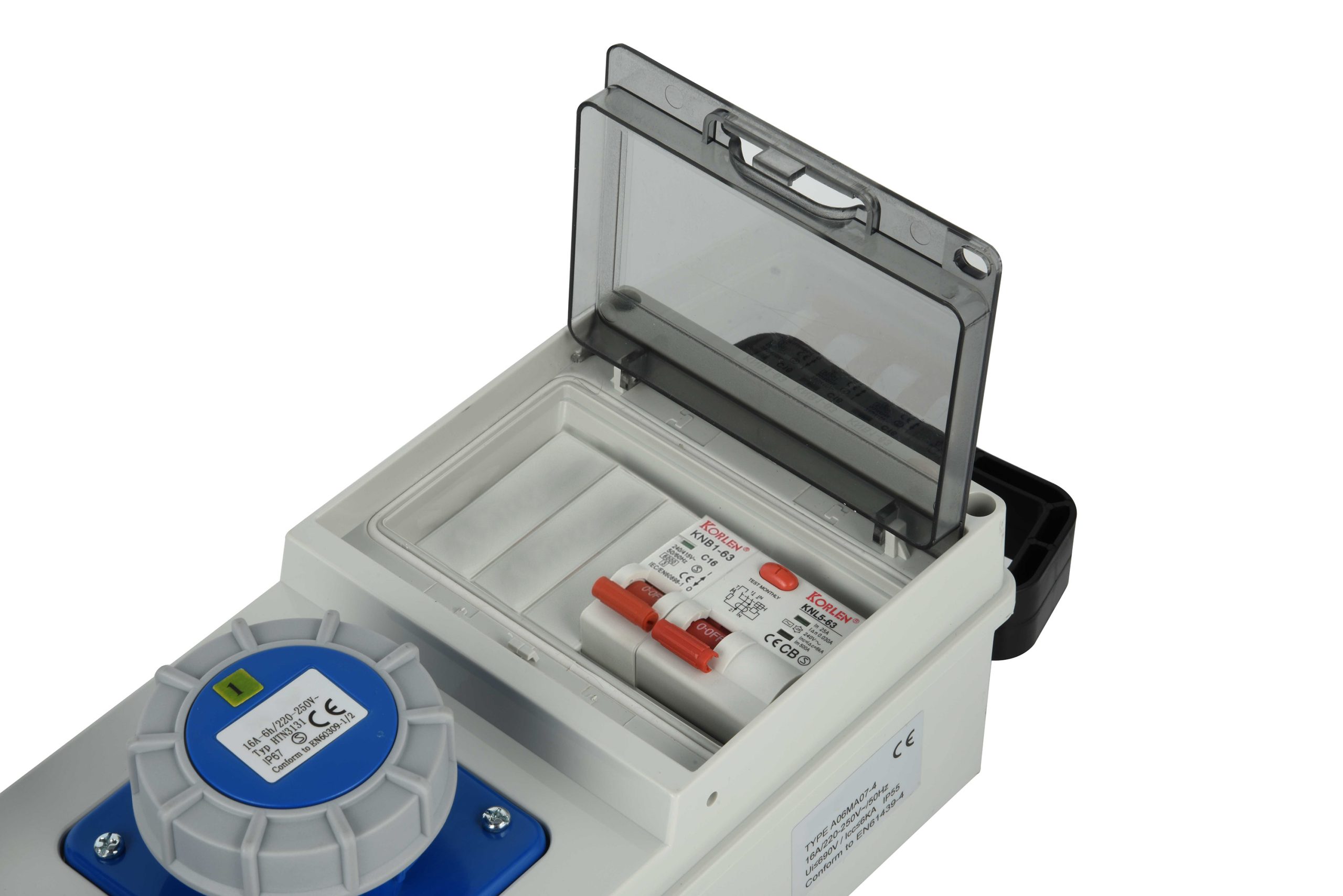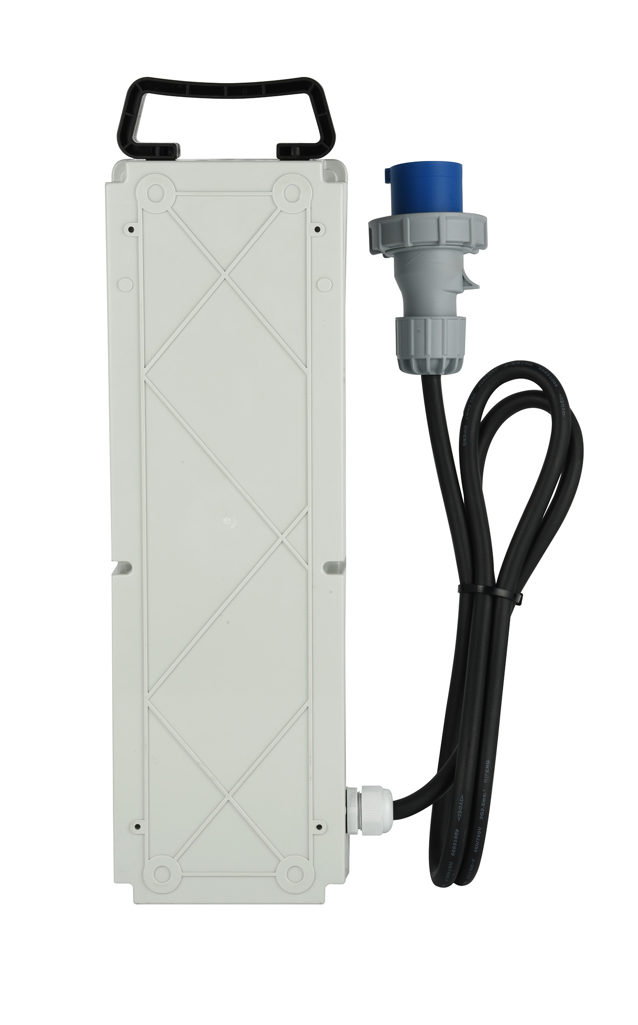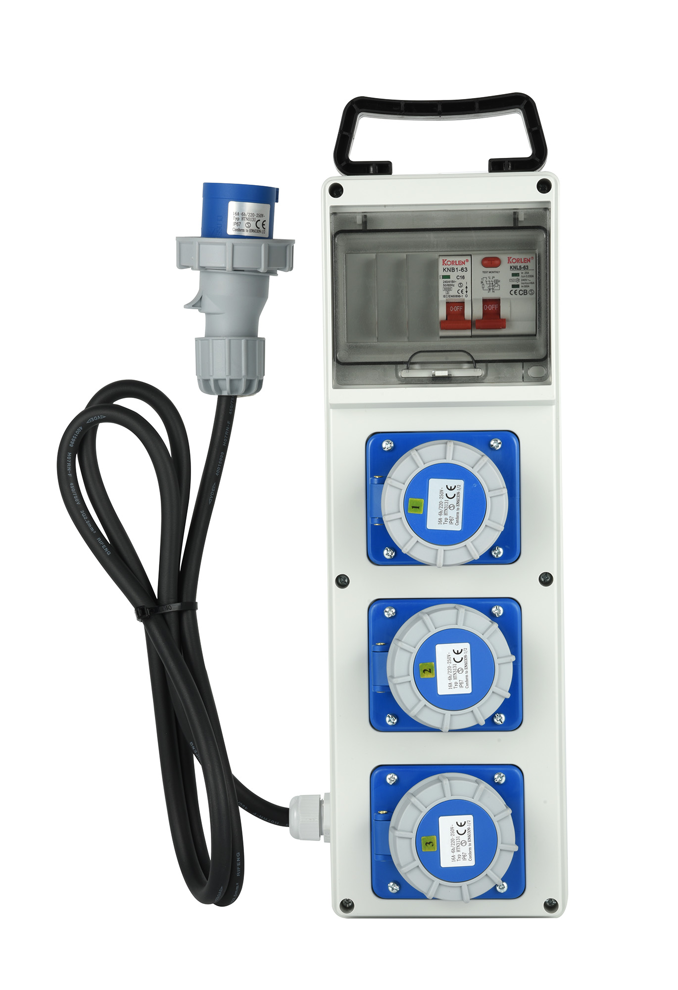 Quadro di distribuzione da cantiere con MCB RCD. 3 prese CEE. H07RN-F 3G2.5. 2m. IP55. Grigio / Blu. Ideale per lutilizzo in cantiere per la distribuzione sicura dellelettricità con protezione da sovraccarichi e dispersioni. Imballo: Etichetta