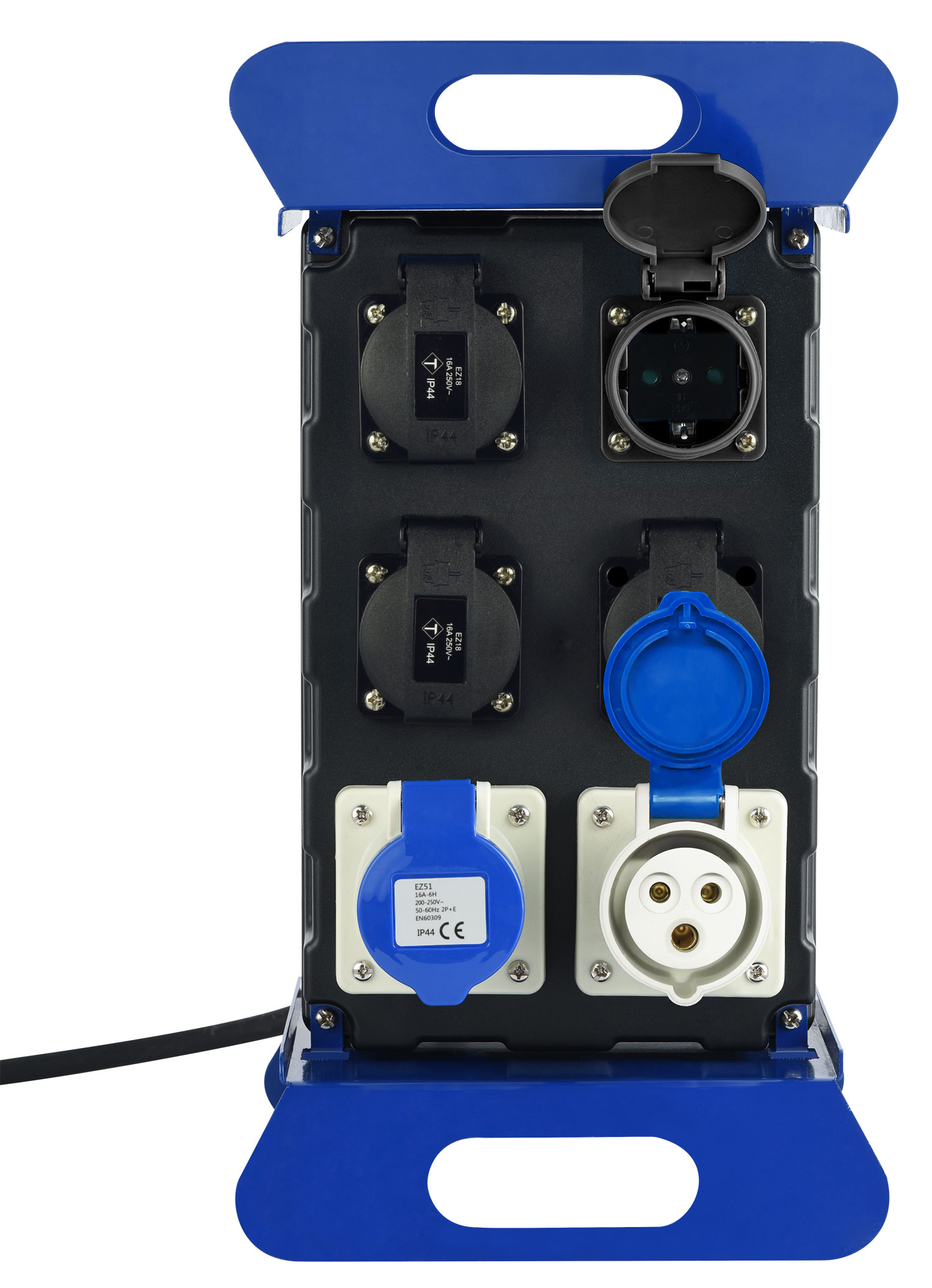 Quadro di distribuzione portatile con MCB 16A. 4 prese Schuko + 2 x CEE. H07RN-F. 3G2.5. IP44. Nero / Blu. Ideale per eventi allaperto. cantieri edili. fiere commerciali. Imballo: Etichetta