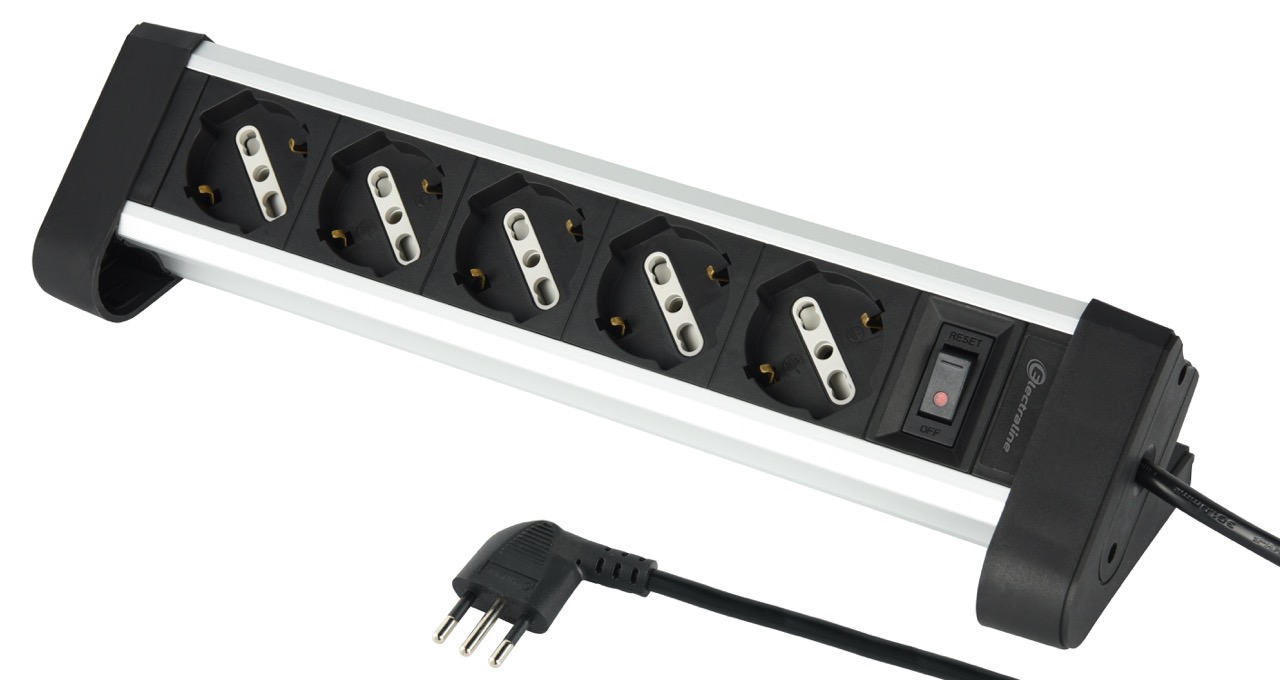 Multipresa Alu. 5 prese. Cavo 2metri. H05VV-F 3G1. Alu / Nero. Per uffici. sale conferenze o ambienti domestici per collegare e proteggere dispositivi elettronici. Imballo: Scatola appendibile