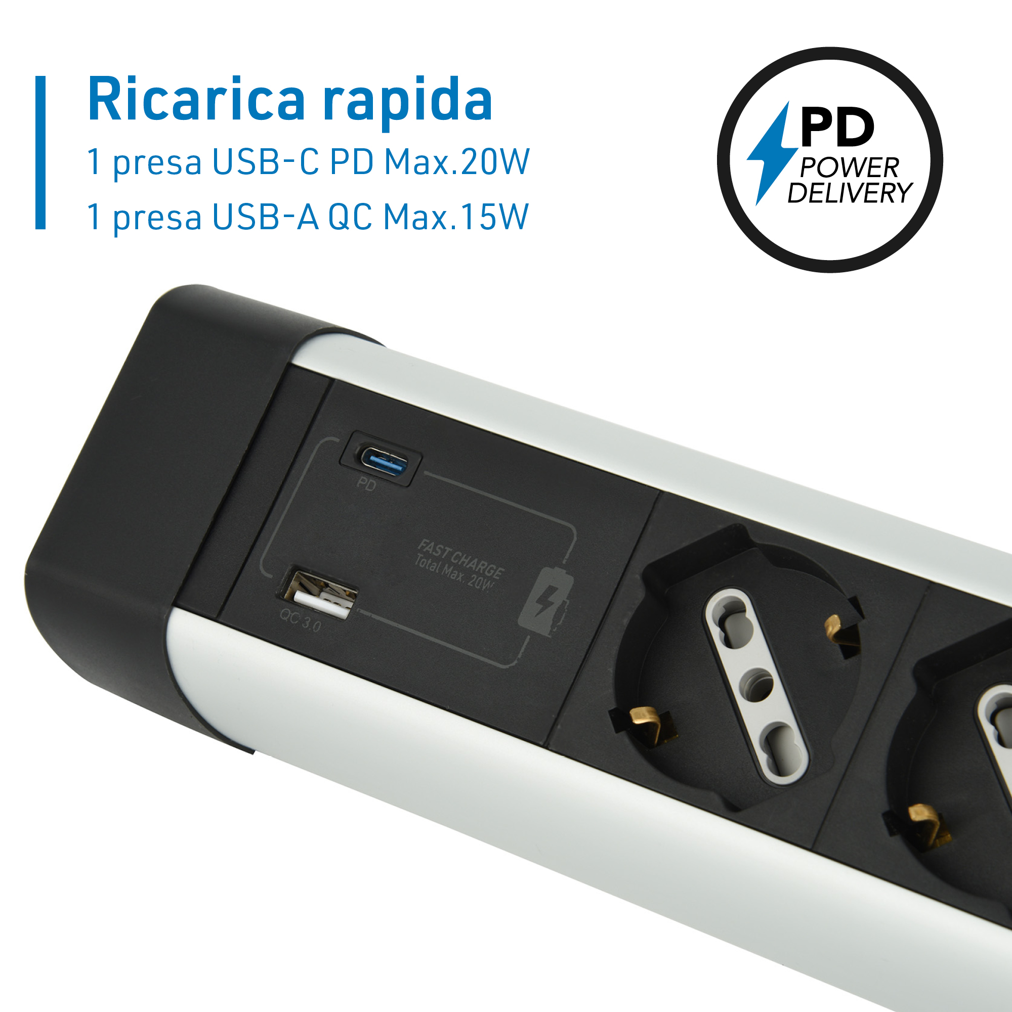 MULTIP.TAV.ALU 3P UNIV+3 USB(2A+1C) PD20W 2M WHITE. Per uffici. sale conferenze o ambienti domestici per collegare e proteggere dispositivi elettronici. Imballo: Scatola appendibile