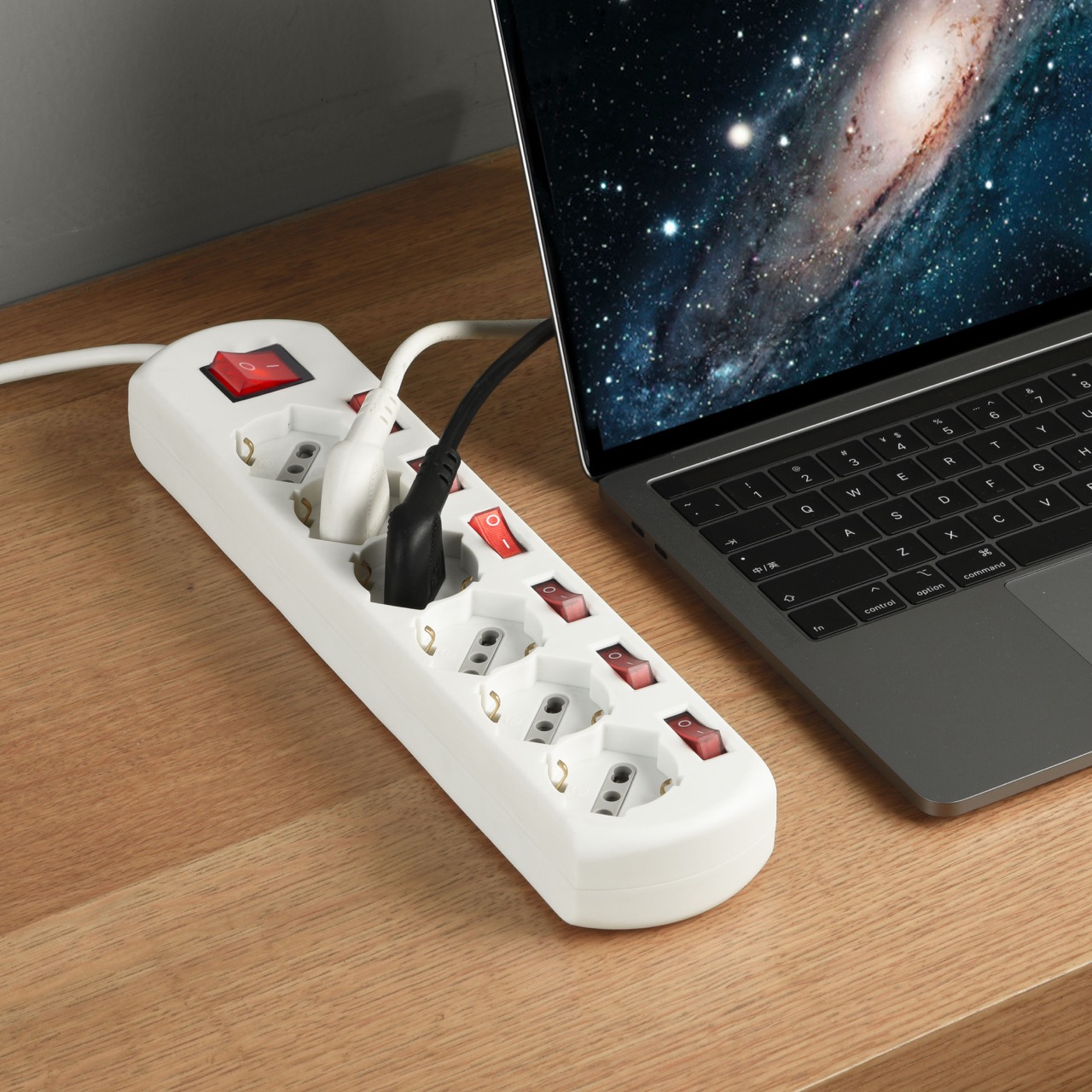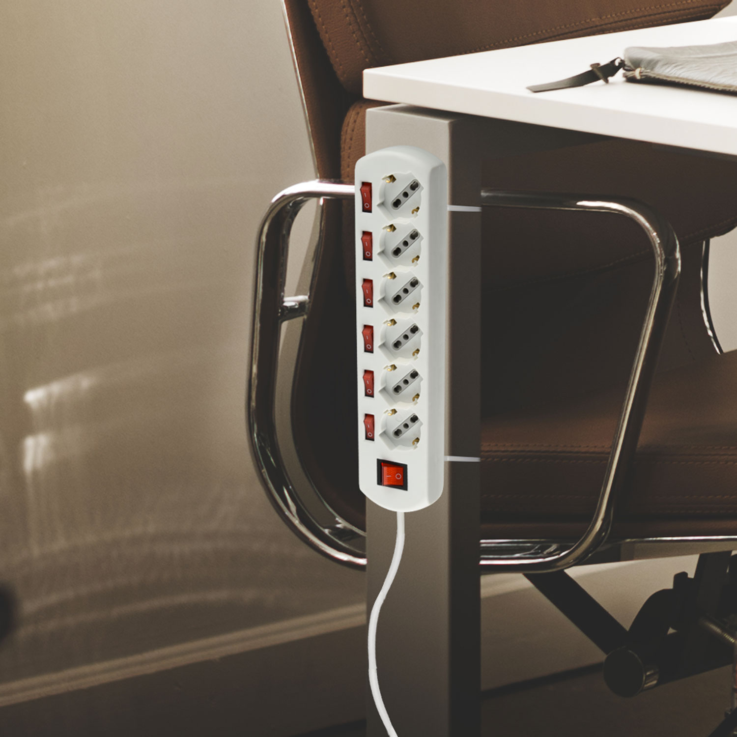 Multipresa 6 prese. interrutore generale e 6 interrutori indipendenti. Cavo 1.5m. H05VV-F 3G1. Bianca. Ideale per uffici. sale conferenze e postazioni di lavoro con necessità di alimentazione e controllo indipendenti. Imballo: Etichetta appendibile