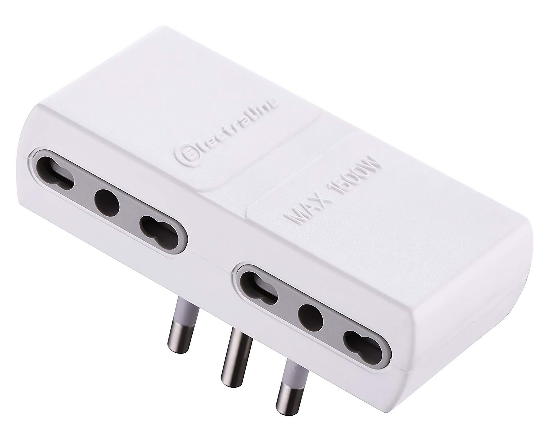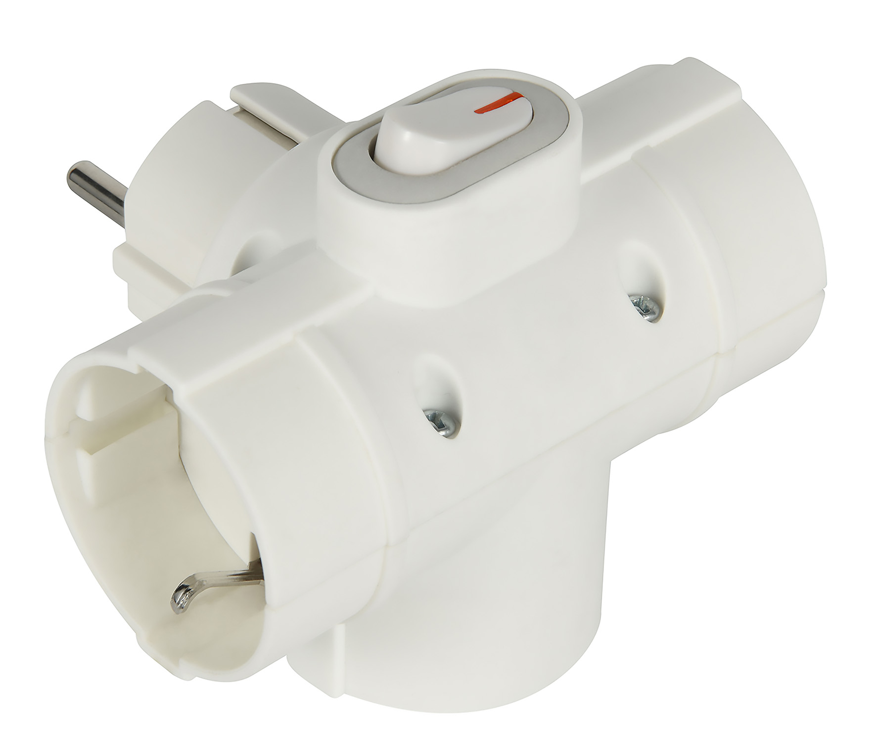 Adattatore triplo Schuko 16A. con interruttore. Bianco. Ideale per collegare tre dispositivi elettrici in ambienti domestici o uffici con presa Schuko. con interruttore integrato. Imballo: Scatola