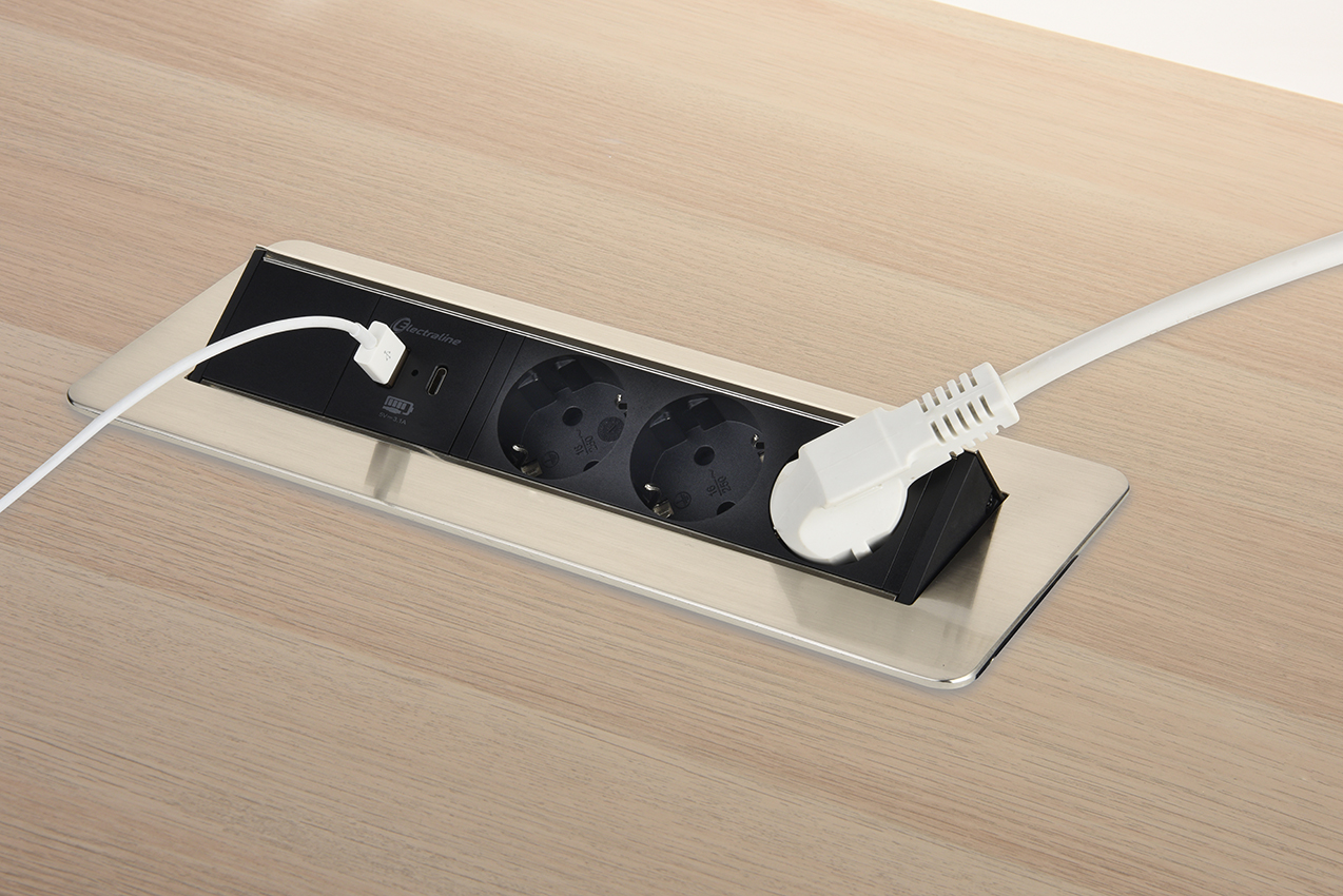 Multipresa pop-up da scrivania orizzontale. 3 prese Schuko + 1 USB-A 2.4A + 1 USB C. cavo 2m .H05VV-F 3G1.5. Alu / Nera. Per uffici moderni. scrivanie minimaliste e postazioni di lavoro. Imballo: Scatola appendibile